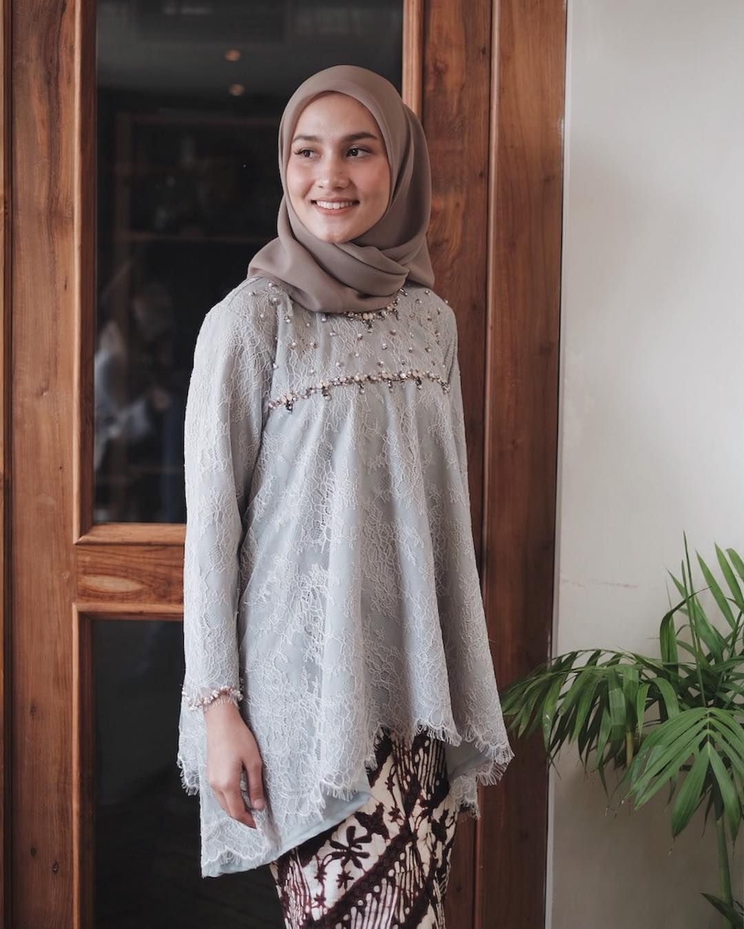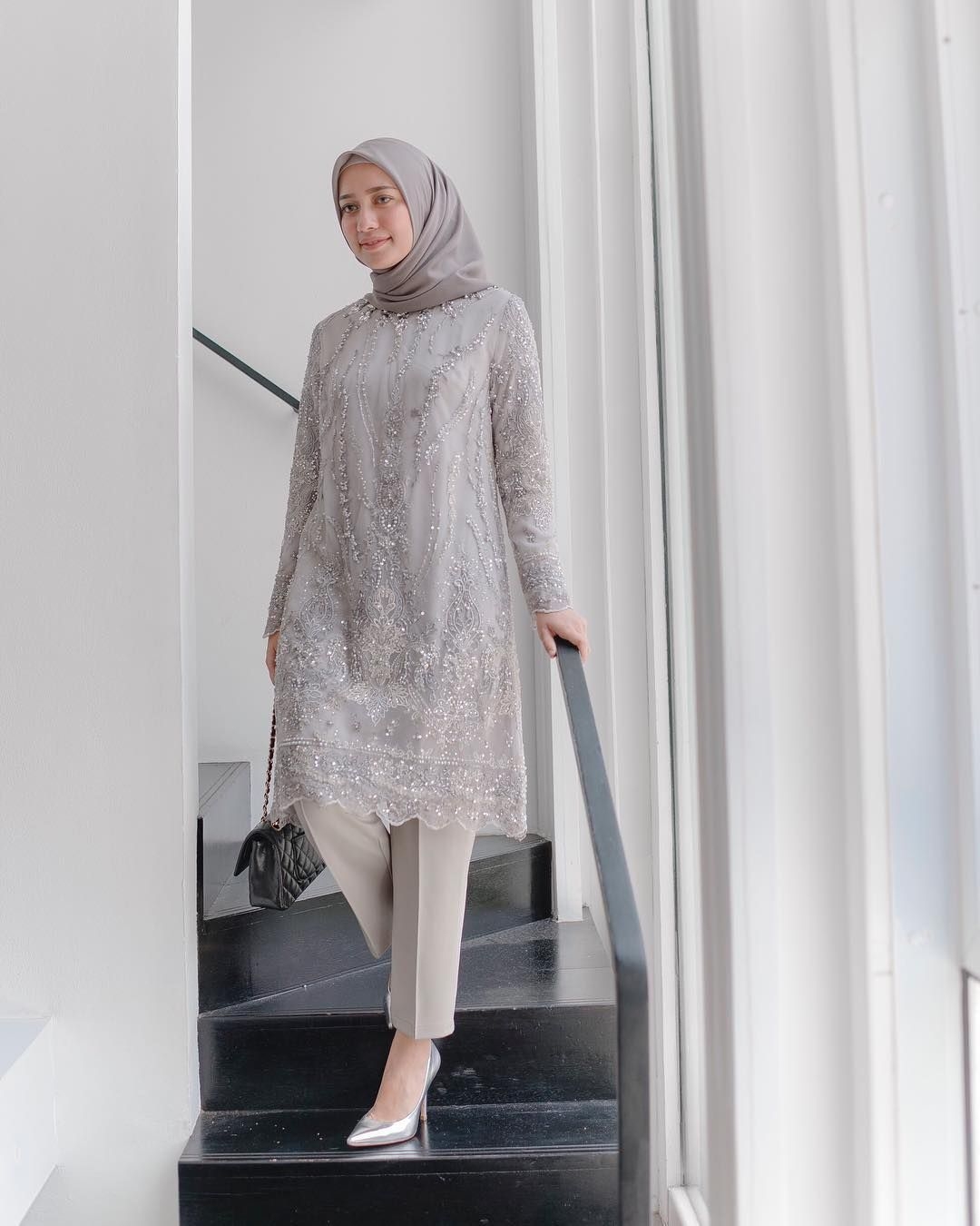 Baju kondangan simple hijab dengan kebaya model blouse. Setelan serba abu-abu ini dapat Anda jadikan pilihan untuk datang ke acara kondangan. Tidak melulu harus dengan rok batik atau dress, Anda dapat tampil formal dengan memakai celana sekalipun.
