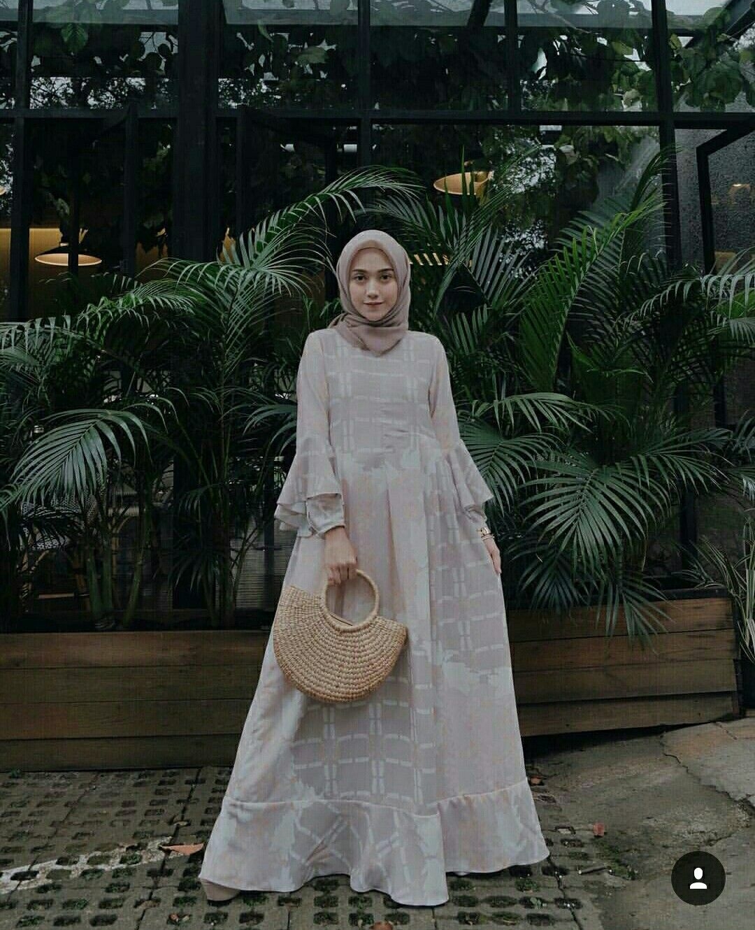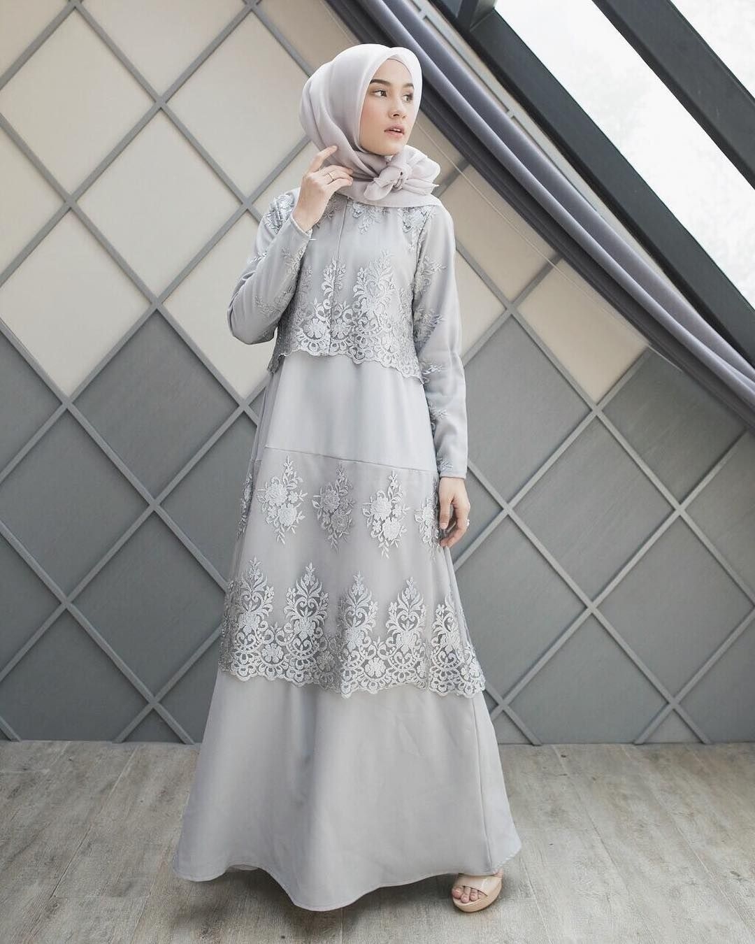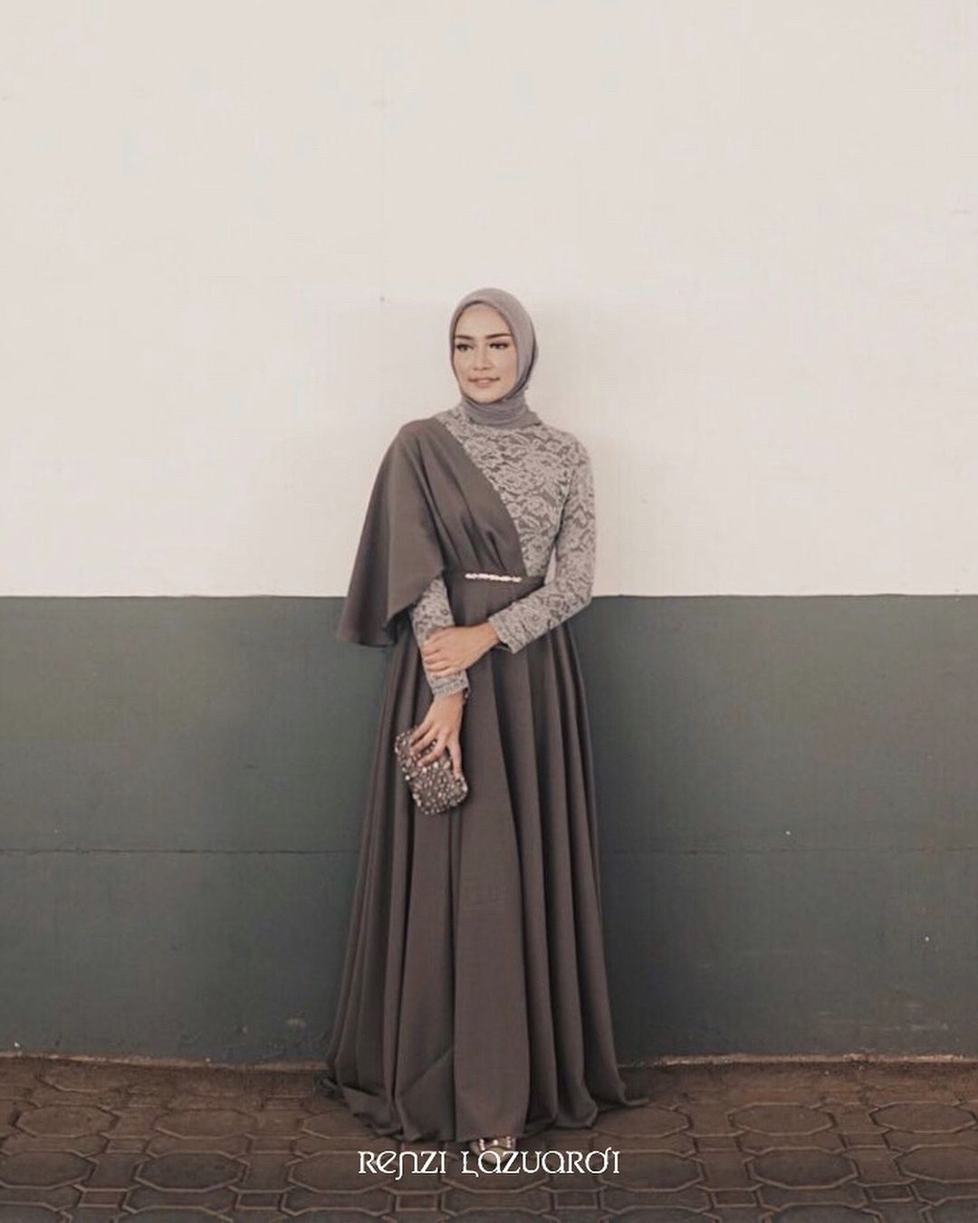 Baju kondangan simple hijab ala mega iskanti dengan tema abu abu