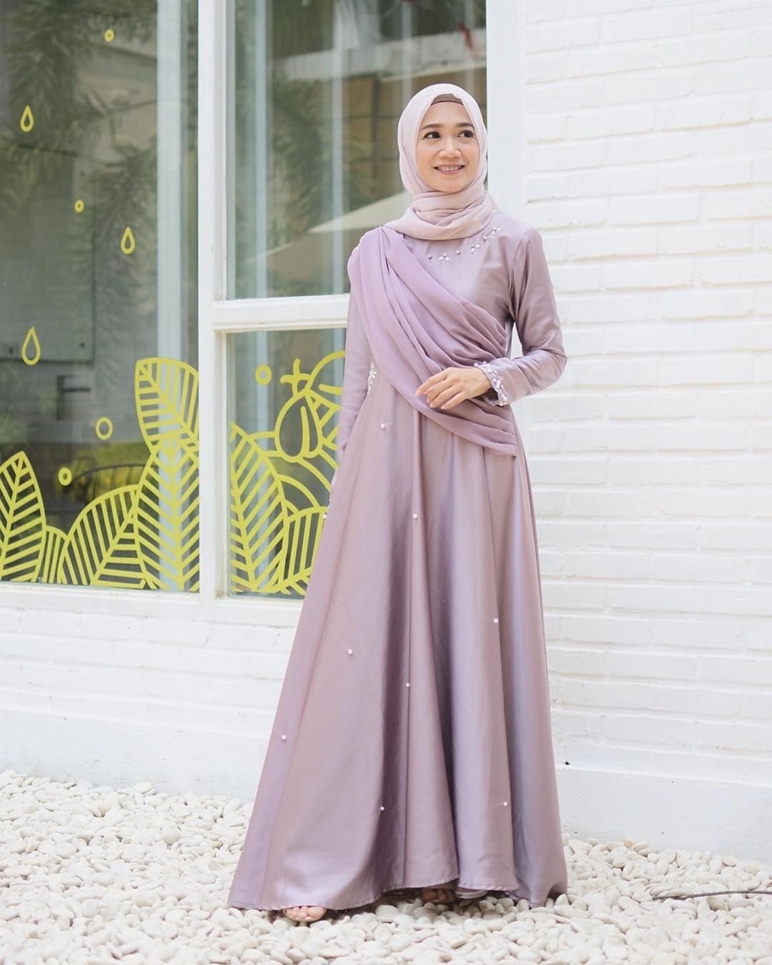 Baju kondangan simple hijab dengan dress kekinian warna ungu soft. Kembali dengan dress, warna ungu ini dapat Anda jadikan pilihan. Kombinasi satin dengan shiffon ini juga sangat cocok untuk dijadikan dress.