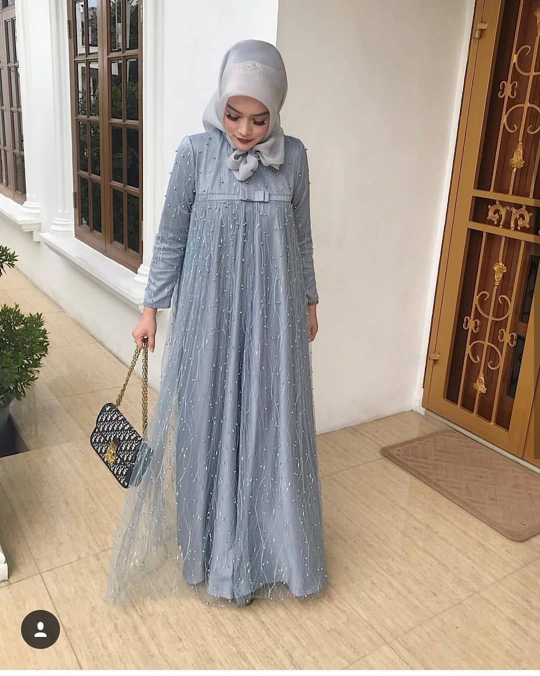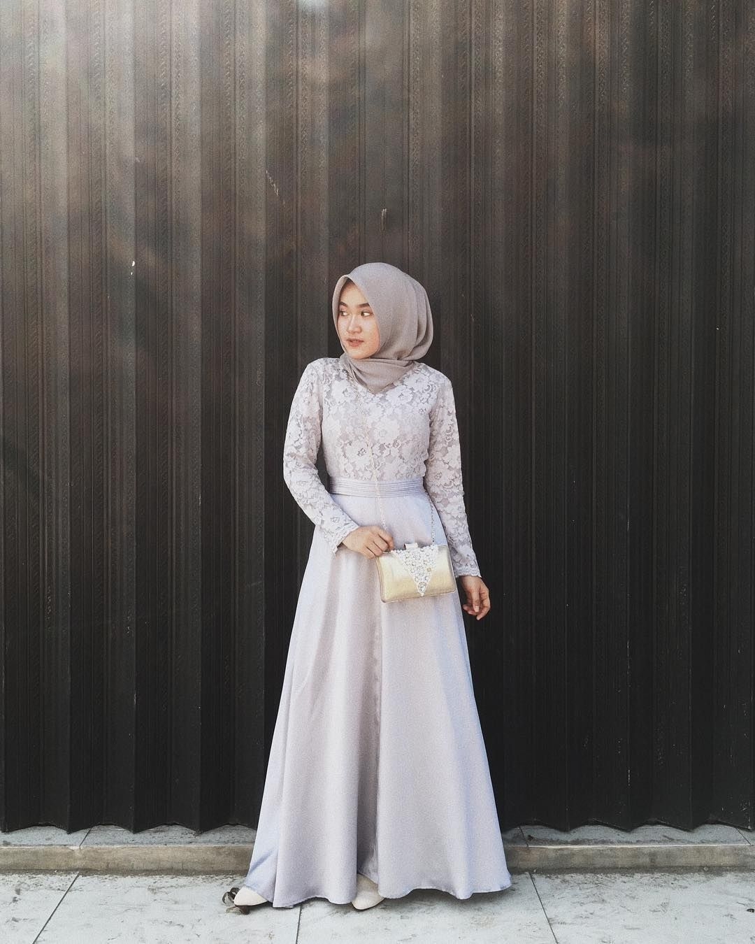 Baju kondangan simple hijab dengan model maxi dress. Anda dapat datang ke acara kondangan dengan maxi dress warna abu-abu seperti di atas. Anda dapat mengkombinasikan bahan satin dan brokat. Tambahkan pula hijab dengan warna senada agar terlihat matching.