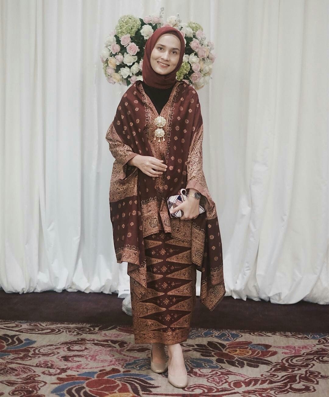 Baju kondangan simple hijab dengan kain adat. Setelan kebaya dari kain adat warna merah ini bisa menjadi pilihan Anda. Atasan dan bawahan yang dibuat dengan motif yang sama ini juga terlihat sangat cantik. Gunakanlah sepatu warna krem yang terlihat netral.