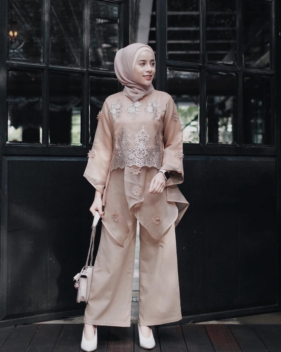 Baju kondangan simple hijab yang stylish. Setelan celana yang dikombinasikan dengan atasan bahan tule dan organza juga sangat cantik. Model atasan dibuat dengan model yang modern ini akan membuat penampilan Anda terkesan stylish.