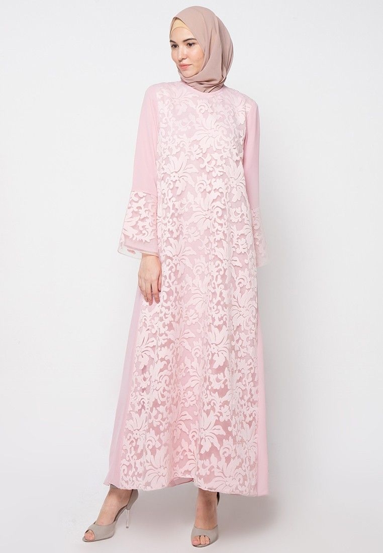 Dress panjang yang terbuat dari puring yang diberikan brokat berwarna soft dan bermotif bunga-bunga berwarna cokelat gelap ini didesain simple. Di bagian perut diberikan tali kecil yang melingkar. Diladukan dengan jilbab warna yang senada membuat penampilanmu terkesan kalem namun tetap elegant. Cocok dipakai untuk menghadiri acara pesta.