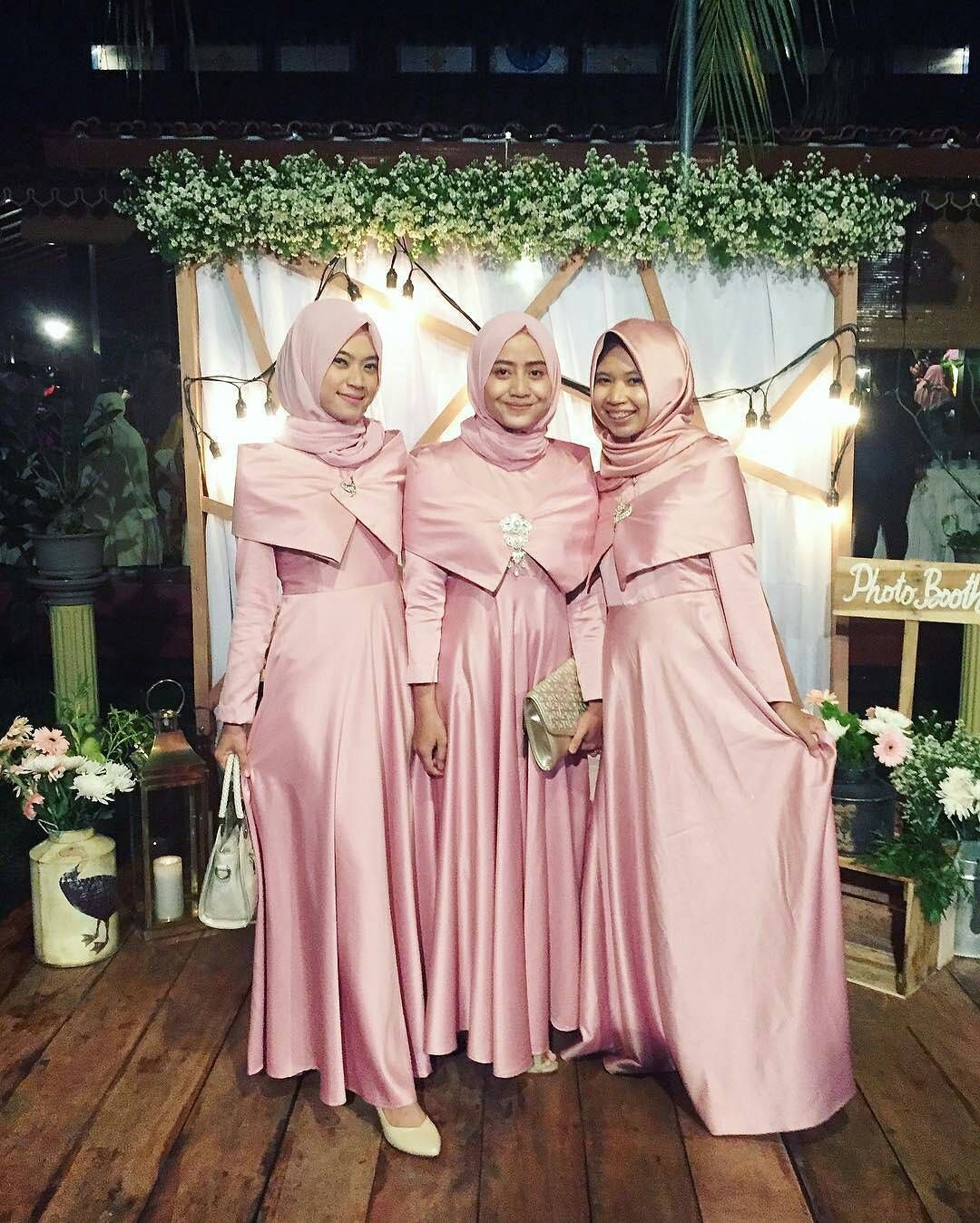 Seragam untuk bridesmaid satu ini dibuat dalam satu model dang bahan yang sama. Dengan pemilihan warna pink polos yang kemudian dibagian lengan dan dada diberi kain yang melingkar berwarna pink senada dan diberikan aksesoris di tengahnya. Jilbab yang dipilih pun juga berwarna pink.
