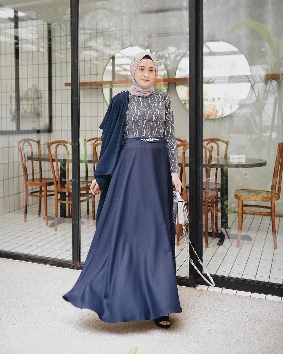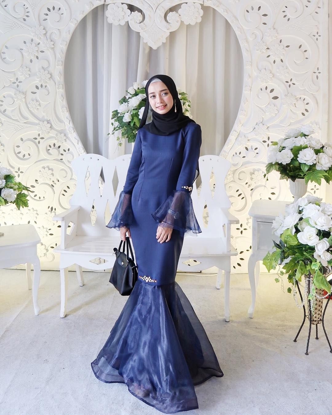 Dress mermaid warna navy ini sebenarnya hanya simple. Tetapi, dengan model pakaian yang ditambahkan dengan sedikit kain dan aksesoris ini menjadi terlihat elegant. Jilbab yang dipilih adalah pasina berwarna hitam. Terlihat cantik sekali.Model pakaian seperti ini lebih cocok dipakai untuk yang memiliki badan kurus dan tinggi.