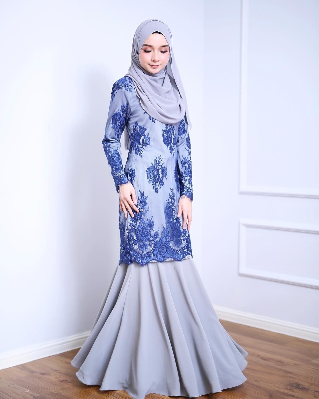 Dress abu-abu dikombinasikan dengan brokat biru