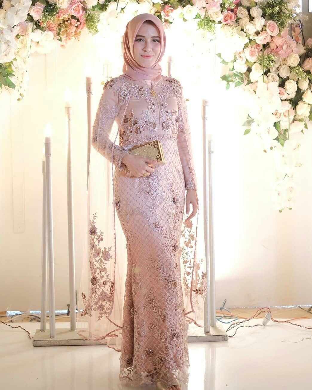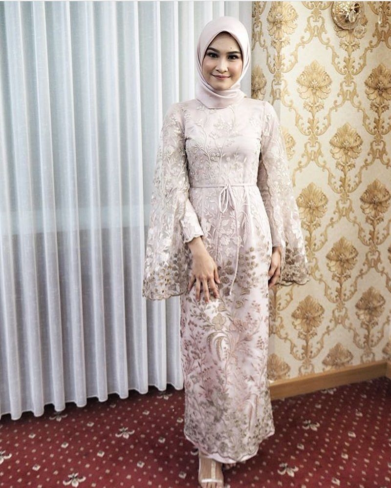 Model gaun ke pesta satu ini terlihat elegant. Dress yang dibalut dengan full brokat ini sangat cantik. Di bagian belakang dibuat seperti jubah cantik dari brokat yang memiliki panjang di atas mata kaki. Jilbab yang dipakai berwarna senada dengan dress, dipakai simple. Penampilan seperti ini cocok dipakai saat pergi ke pesta.