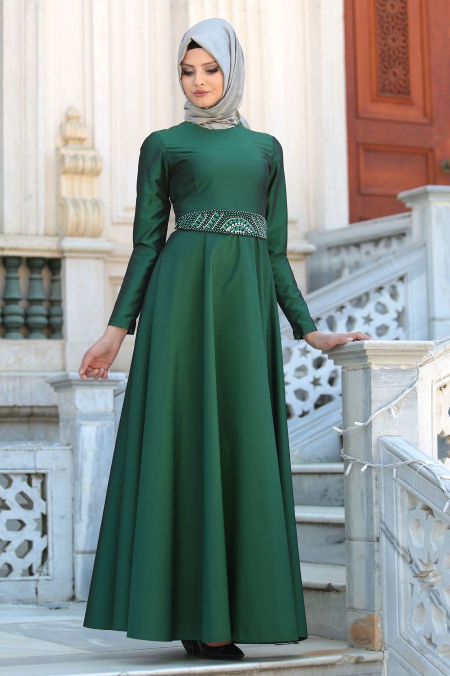 Dress hijau polos ini bisa dipakai untuk menghadiri acara pesta. Desain drees ini sangat simple karna hanya mengkombinasikan dengan ikat di bagian perut berwarna hijau motif. Jilbab yang dipilih pashmina berwarna abu-abu, cocok dipadukan dengan dress hijau polos ini.