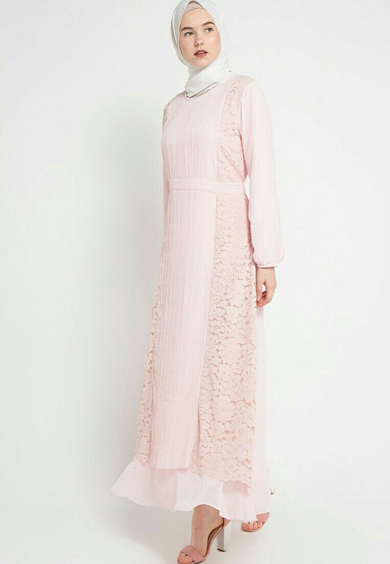 Dress berwarna soft pink ini sangat simple. Hanya dengan mengkombinasikan brokat di bagian depan dan sedikit di bagian tangan dengan warna senada, dress ini terlihat sangat elegant. Tidak perlu menambah banyak aksesoris lagi. Jilbab yang dipakai pashmina berwarna cream yang cocok jika dipadukan dengan warna pink. Dress seperti ini cocok dipakai saat kondangan.