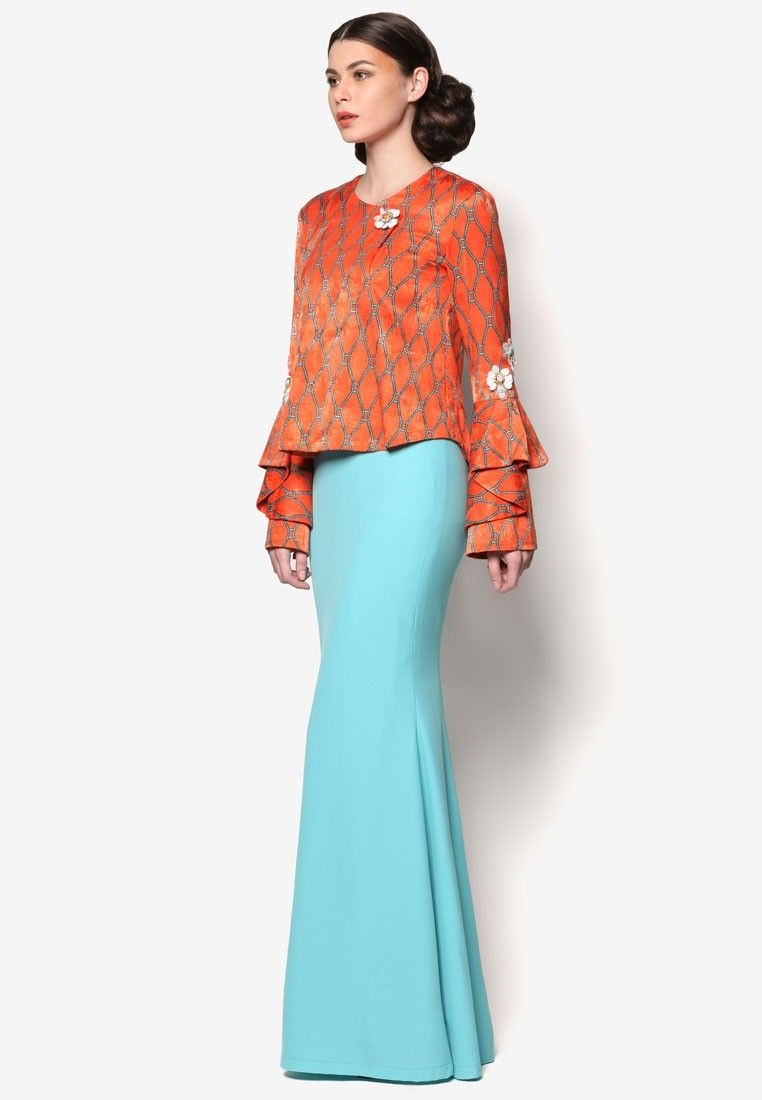 Baju warna orange dipadukan dengan bawahan biru Tosca