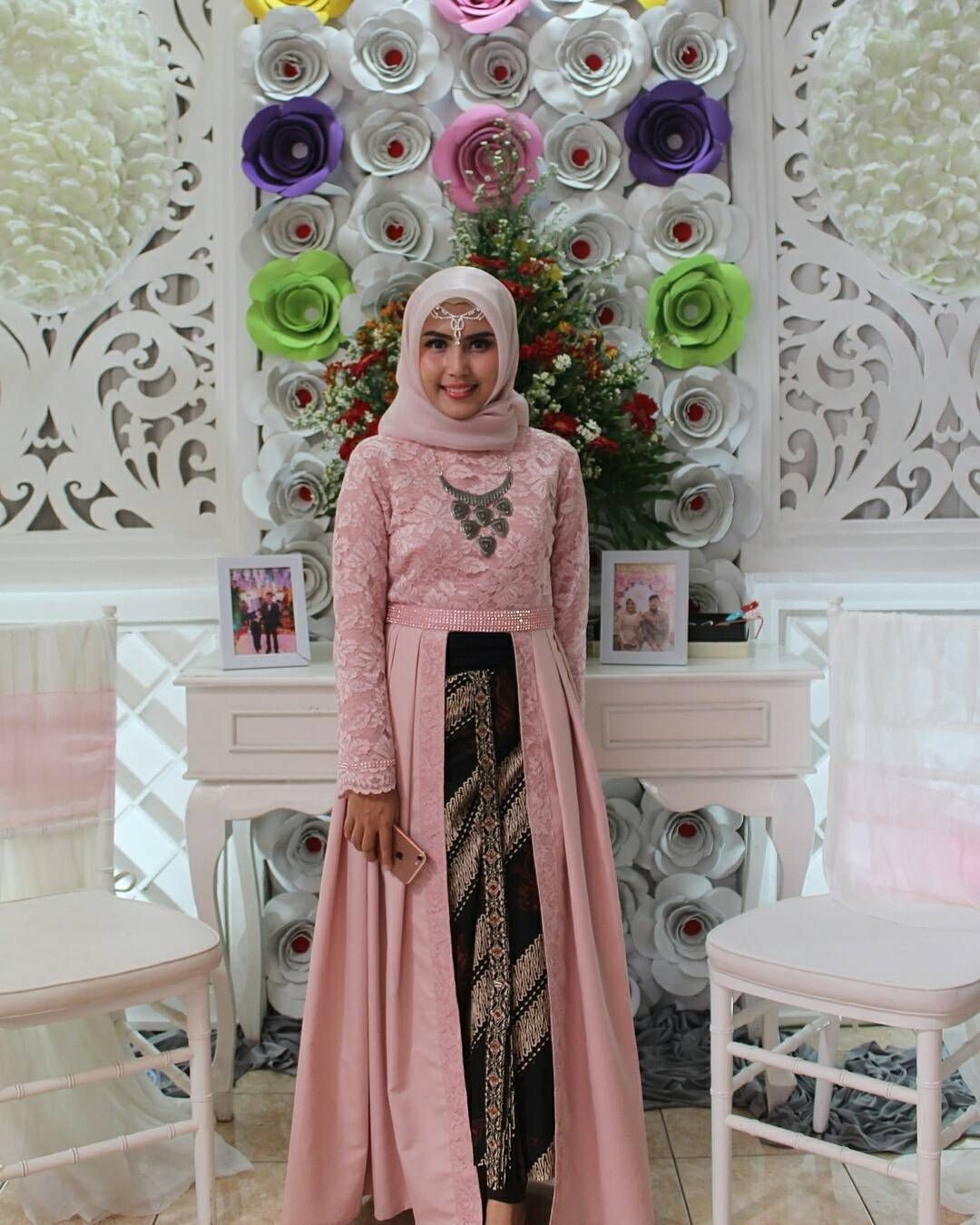 Kebaya kutu baru hijab dengan warna manis memakai warna pink soft. Anda dapat memilih warna yang senada untuk atasan dan bawahannya. Kebaya dari bahan brokat ini juga sangat cantik ketika Anda kenakan. Ditambah dengan aksesoris juga semakin membuat Anda menawan.