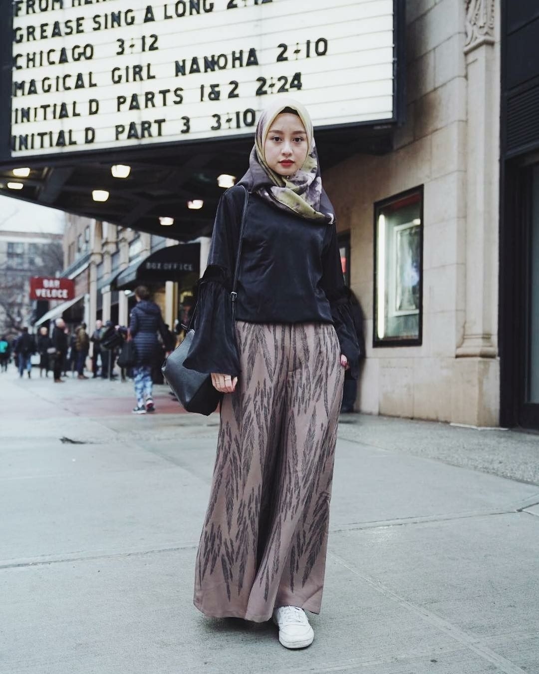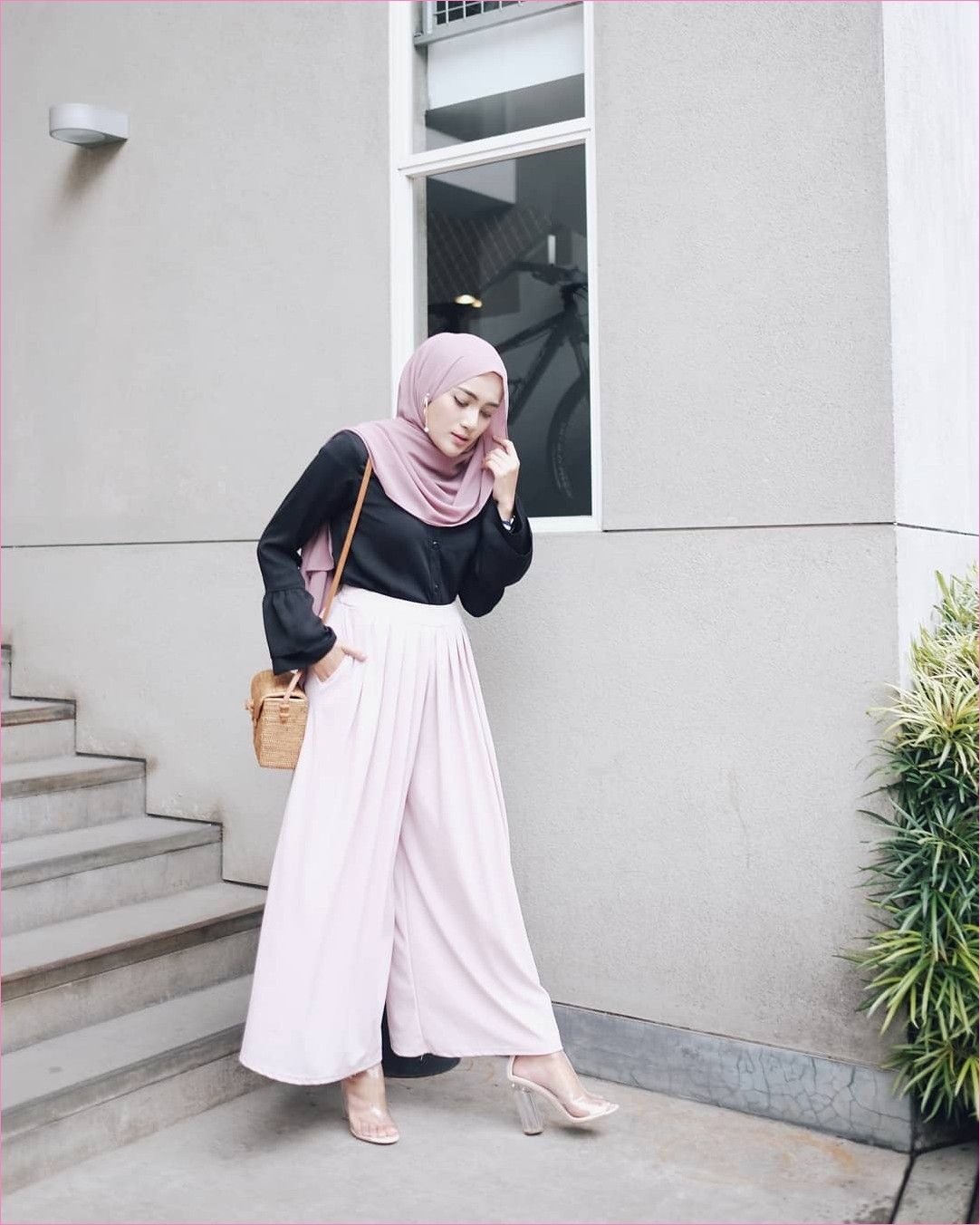 Style baju hijab simple dengan celana kulot warna soft ini juga bisa jadi referensi Anda. DIpadukan dengan blouse warna hitam dengan model lonceng pada lengan ini juga sangat cocok. Setelah itu, Anda dapat menggunakan hijab pashmina dengan bahan chiffon yang berwarna pink pula.