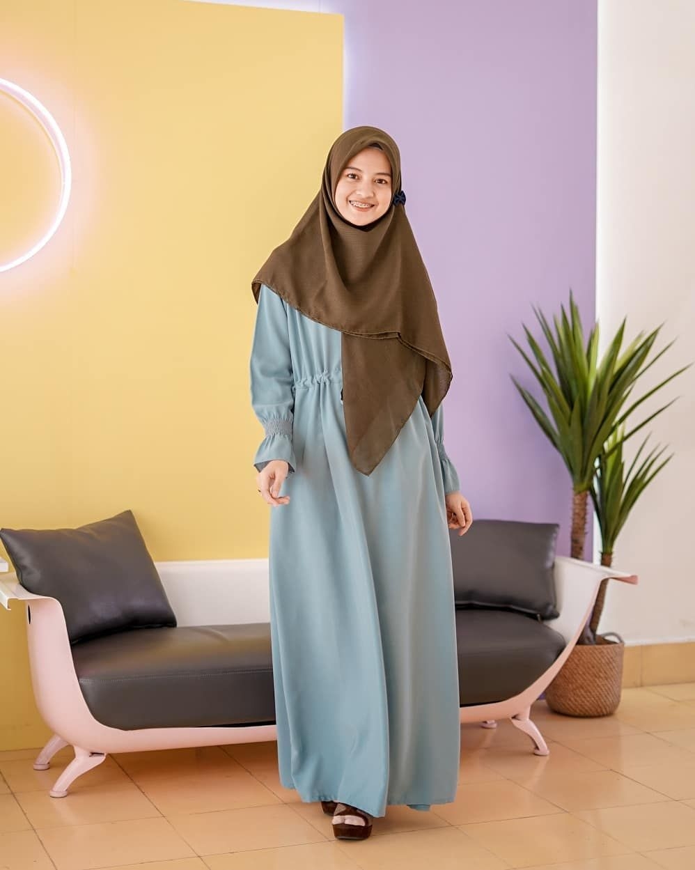 Style baju hijab simple dengan dress warna biru ini bisa Anda gunakan untuk acara-acara semi formal. Anda dapat memadukannya bersama hijab warna kontras yang dipakai dengan brooches yang cantik. Sangat cantik bukan?