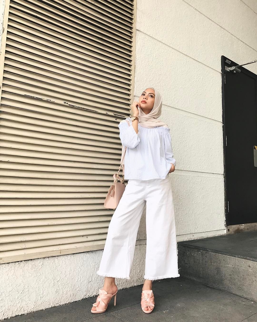 Style baju hijab simple dengan gaya chic bertema putih. Anda dapat memadukan blouse dengan celana kulot yang berbahan denim warna putih ini. Tambahkan dengan hijab warna krem yang serasi dengan high heelsnya.