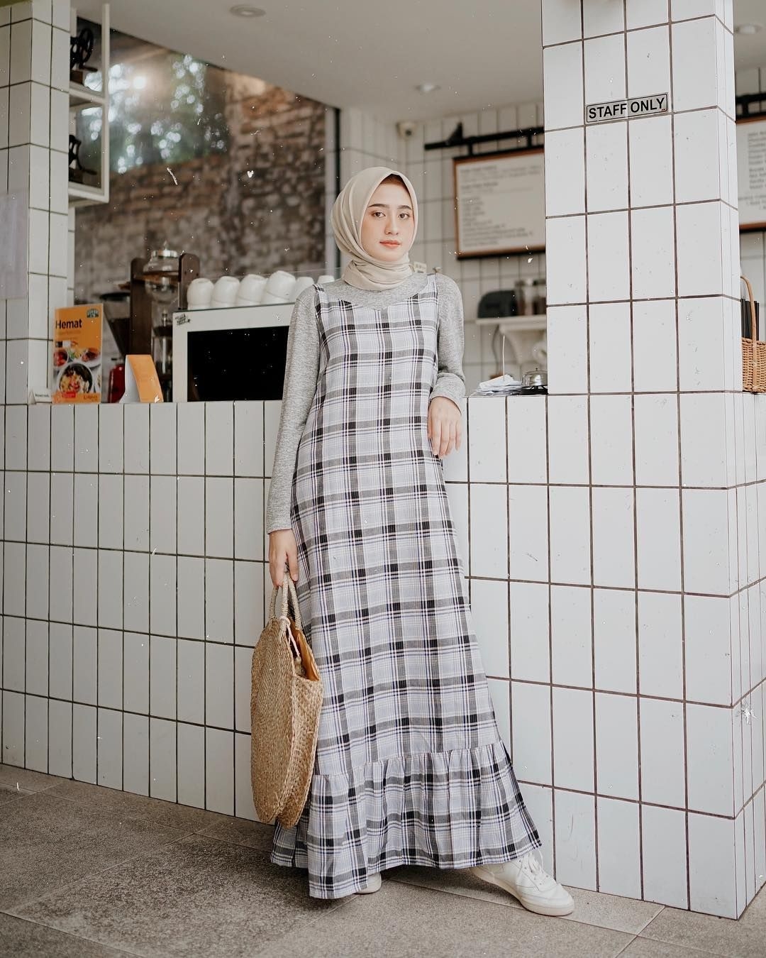 Style baju hijab simple yang kasual dengan strap dress kekinian ini. Anda dapat memilih inner putih dan juga ditambahkan sepatu kets dengan warna putih pula. Hijab segi empat juga sangat pas dipadukan pada gaya ini.