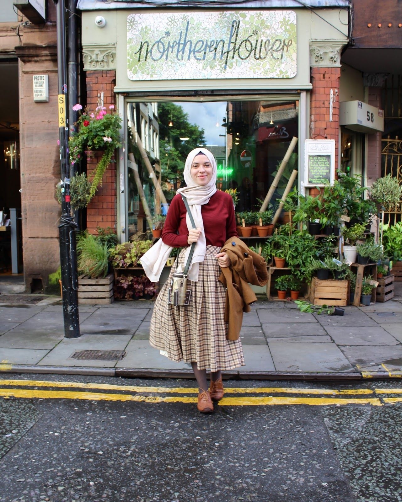 Style baju hijab simple dengan gaya vintage. Memakai skirt yang panjangnya 7/8 ini bisa menjadi pilihan untuk bergaya vintage. Tentu jangan sampai lupa untuk memakai stocking atau legging. Anda dapat memadukannya dengan kaos merah dan juga scarf dari pashmina ini. Sepatu coklat juga menambah kesan vintage.