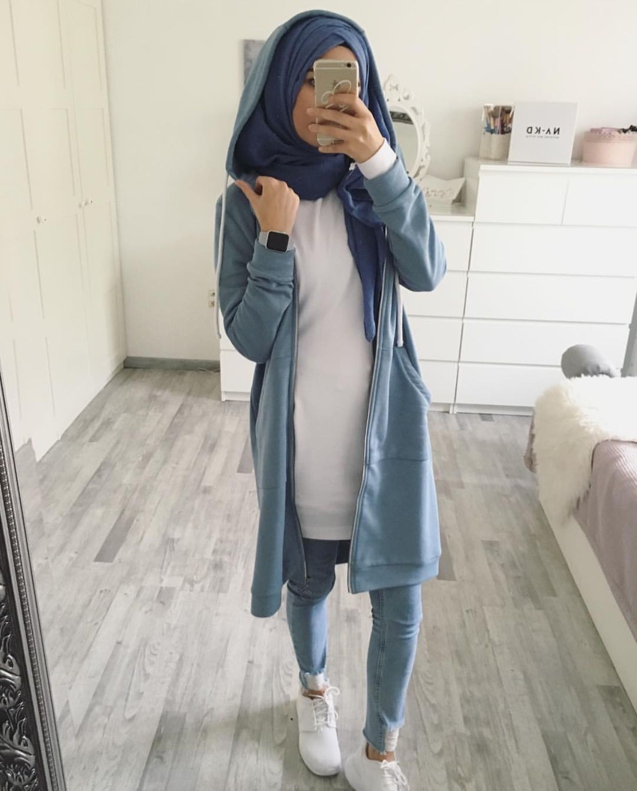 Style baju hijab simple serba denim ini juga terlihat kece. Anda dapat memilih jacket dengan model panjang dan celana yang warnanya senada. Ditambahkan dengan blouse warna putih yang panjang pula dan sepatu putih pula. Perpaduan yang sangat pas.