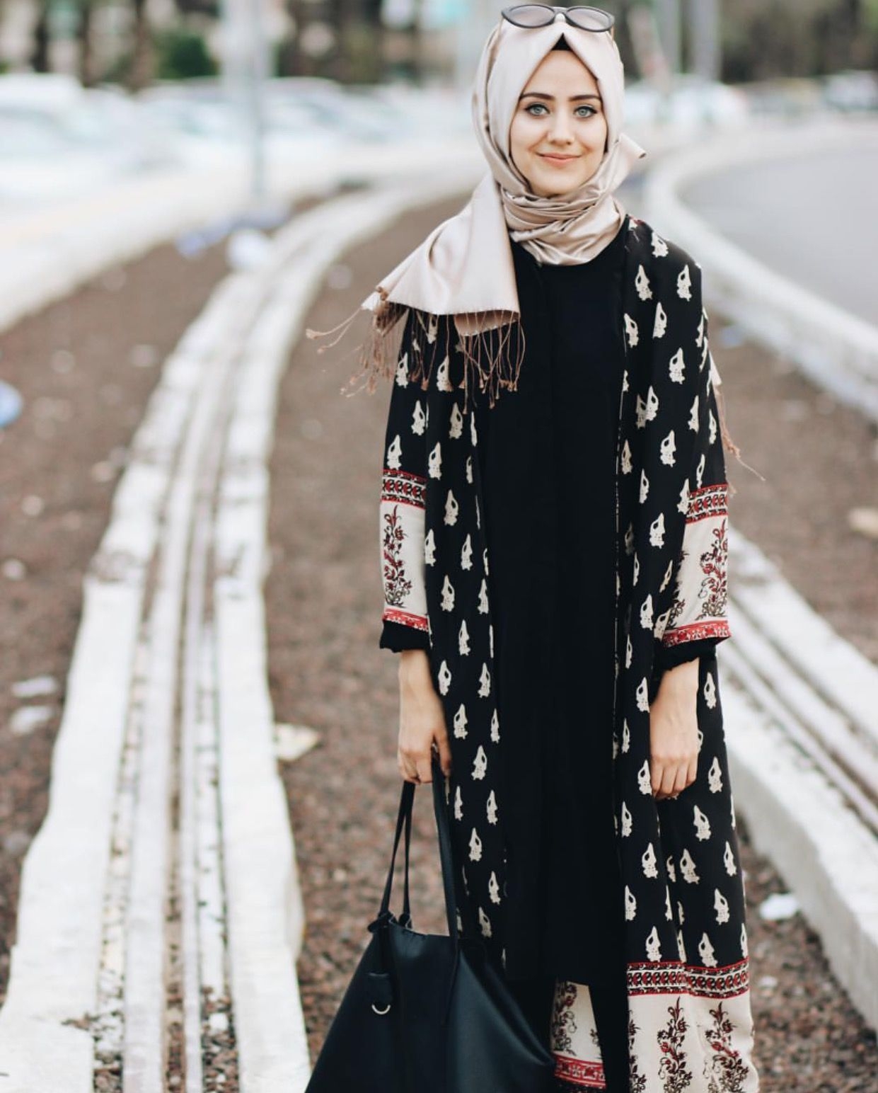 Style baju hijab simple dengan long outer dengan motif yang lucu ini bisa Anda jadikan pilihan. Anda dapat menambahka setelan warna hitam yang netral sebagai inner. Gunakan pula hijab segi empat yang dipakai dengan cara ditali pada bagian belakang. Sehingga akan menambah kesan simple pada penampilan Anda.