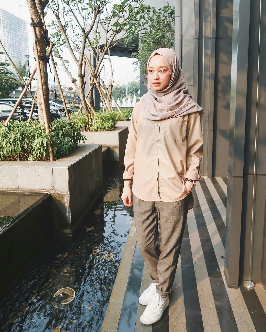 Style baju hijab simple dengan pashmina warna nude. Anda dapat memadukannya dengan kemeja dan juga pants warna coklat yang senada dengan hijab pashmina Anda. Menambahkan sneaker warna putih ini menambah kesan simple.