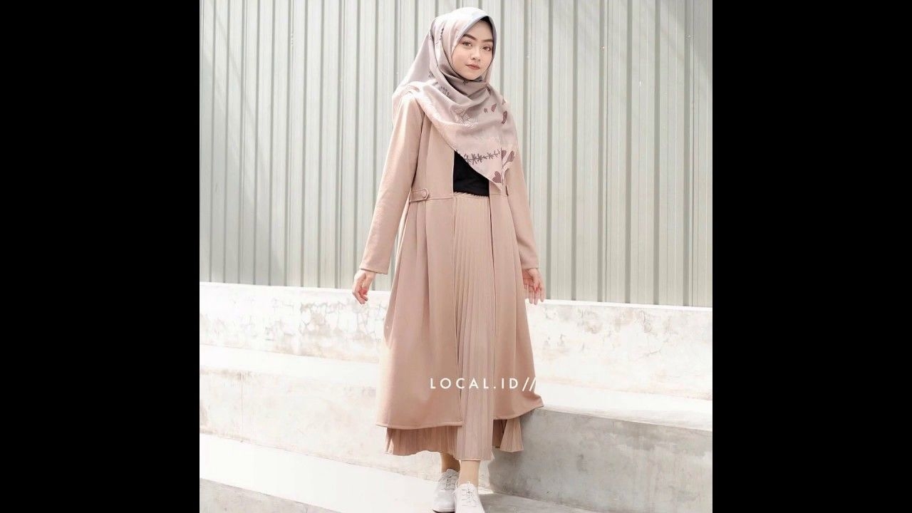 Style baju hijab simple dengan rok plisket warna nude. Anda dapat memadukannya dengan long outer dengan warna yang sama. Ditambahkan dengan hijab motif yang berwarna sama pula membuat penampilan Anda ini sangat apik.