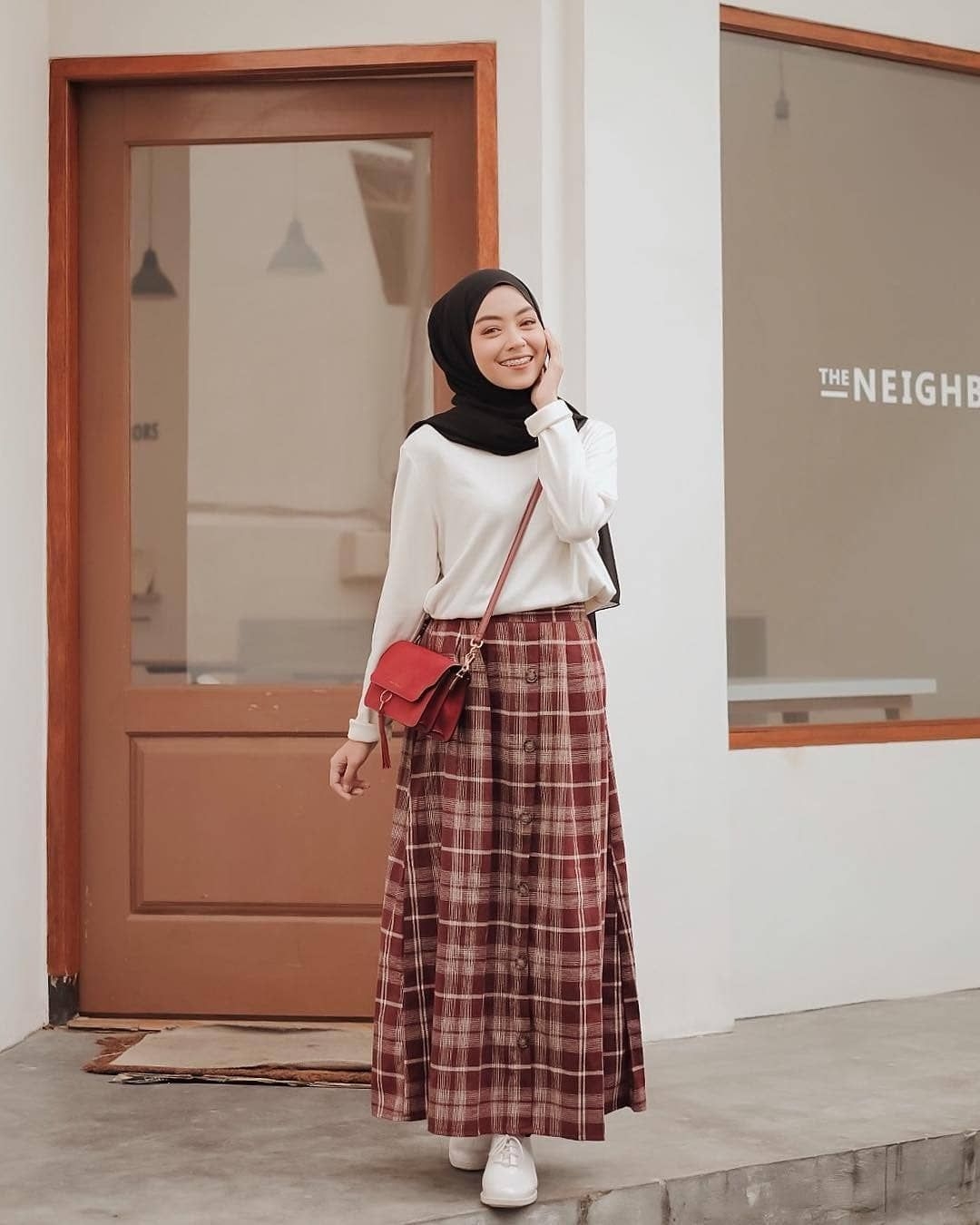 Style baju hijab simple dengan skirt motif kotak-kotak dengan warna merah ini terlihat sangat cantik. Perpaduannya dengan atasan berupa kaos warna krem ini. Memilih hijab pashmina dengan pemakaian yang simple ini juga pemilihan yang tepat.
