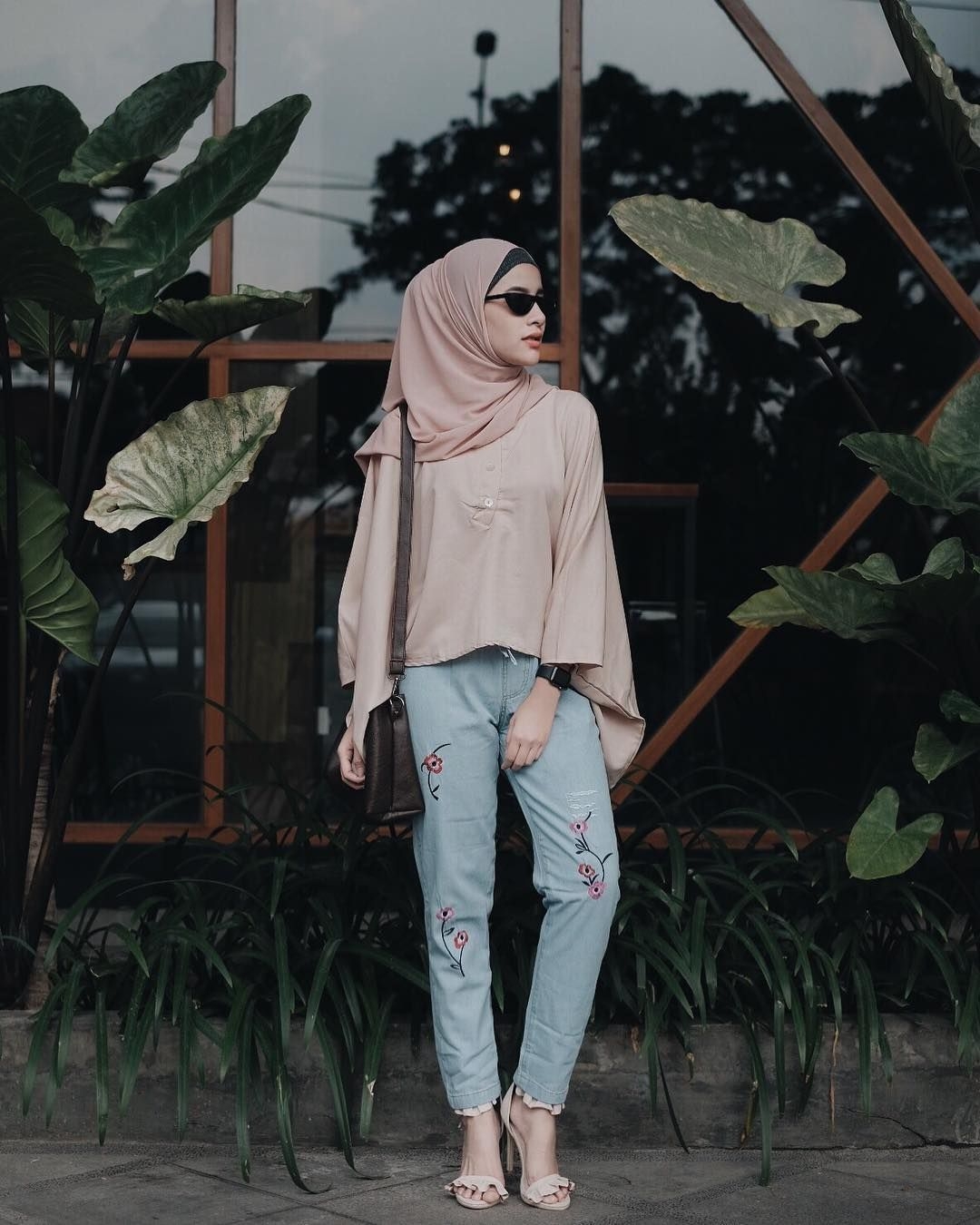 Style baju hijab simple nan santai dengan blouse oversized. Memilih warna salem dan juga hijab warna sama ini terlihat sangat manis. Dipadukan dengan celana denim ini yang membuat Anda terkesan santai. Ditambahkan dengan high heels warna krem yang netral ini juga sangat pas.