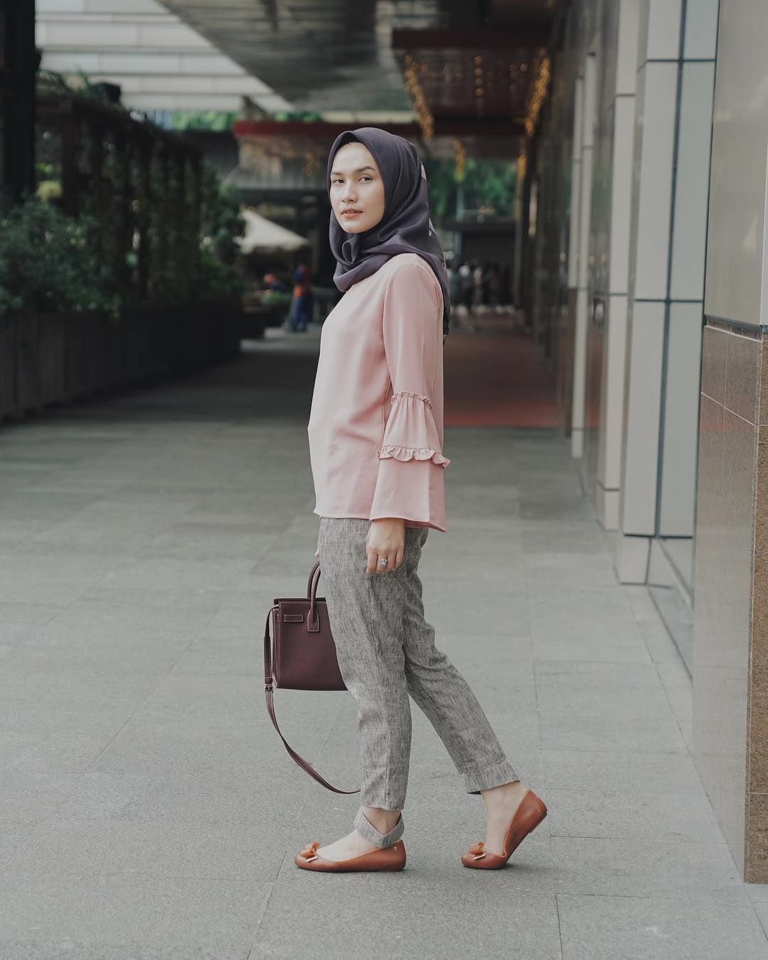 Style baju hijab simple untuk jalan jalan dengan pants warna abu-abu. Anda dapat memadukannya blouse warna peach dan juga hijab segi empat motif dengan warna hitam. Oh iya, pilihlah flat shoes sebagai alas kaki agar lebih nyaman ketika dipakai jalan-jalan.