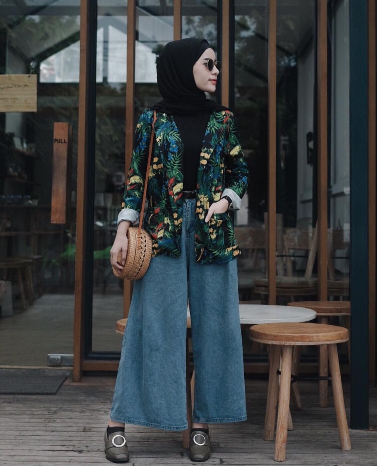 Style baju hijab simple untuk liburan dengan flowery outer terlihat sangat cocok. Dipadukan dengan celana kulot yang berbahan denim ini menambah kesan santai. Gunakan tas anyaman yang sedang hitz ini juga membuat tampilan liburan Anda terlihat hitz pula.