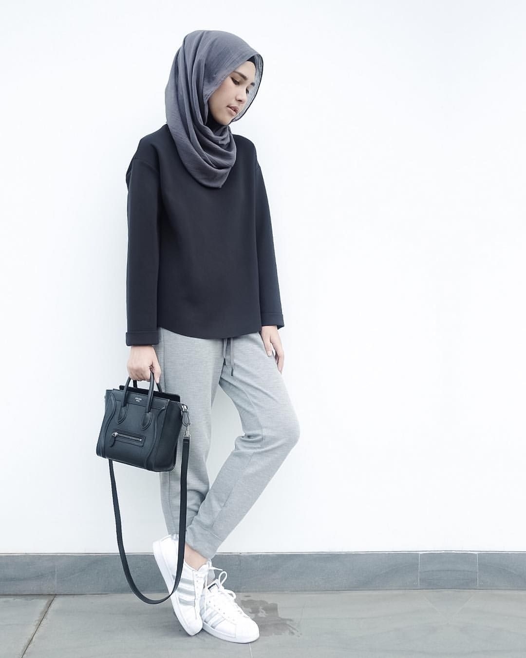 Style baju hijab simple untuk sehari hari dengan celana yang sedang menjadi trend ini. Celana dengan model jogger pants ini memang nyaman ketika digunakan sehari-hari. Anda dapat dipadukan dengan blouse warna hitam dan hijab warna putih ini membuat Anda bertema serba monochrome. Ditambahkan dengan sepatu putih dan tas hitam, lengkap sudah.