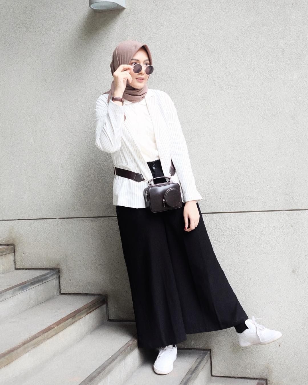 Style baju hijab simple yang modern dengan menambahkan aksesoris-aksesoris kekinian. Anda dapat memadukan atasan dan bawahan dengan warna hitam dan putih seperti di atas. Ditambahkan dengan kacamata dan sling bag dengan model kekinian ini yang membuat penampilan Anda terlihat modern.