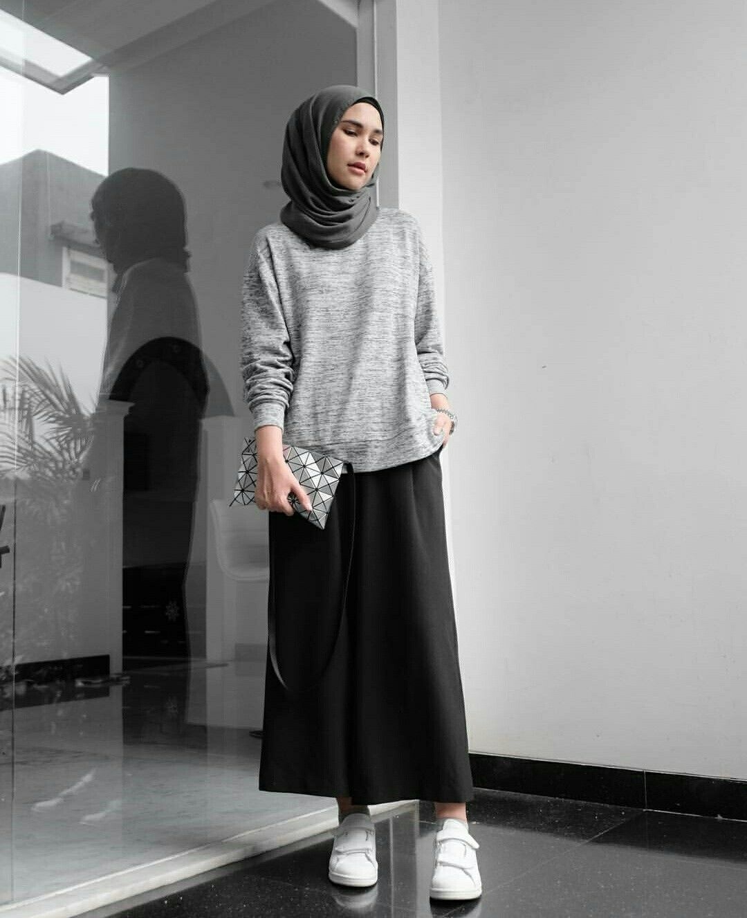 Style baju hijab simple yang sederhana dengan warna monochrome. Perpaduan kaos yang berwarna abu-abu bersama celana kulot warna hitam ini yang membuat tampilan Anda terkesan sederhana. Memilih hijab dengan warna abu-abu ini juga pilihan yang tepat. Ditambahkan dengan sneaker warna putih ini juga sangat cocok.