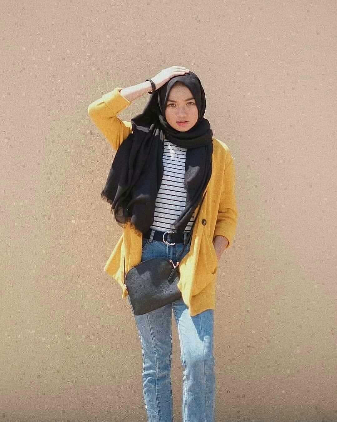 Style baju hijab simple yang terkesan tomboy dengan kaos horizontal striped. Dipadukan bersama celana denim dengan cara dimasukkan ini membuat Anda semakin terkesan tomboy. Hijab pashmina hitam pun juga menjadi pelengkap yang pas. Lalu, memilih warna kuning pada outer Anda juga sangat cocok dipadukn.