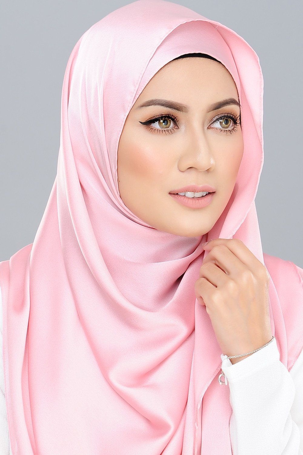 Tutorial hijab pashmina satin untuk kulit putih dengan memilih warna pink terang seperti di atas. Model hijab seperti di atas juga membuat Anda terlihat feminin. Simak caranya berikut ya: