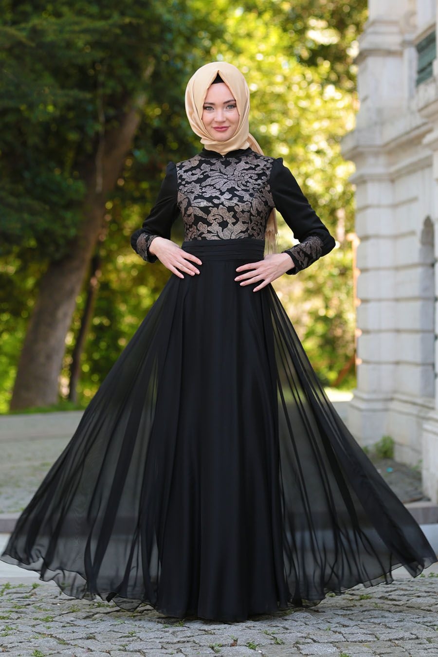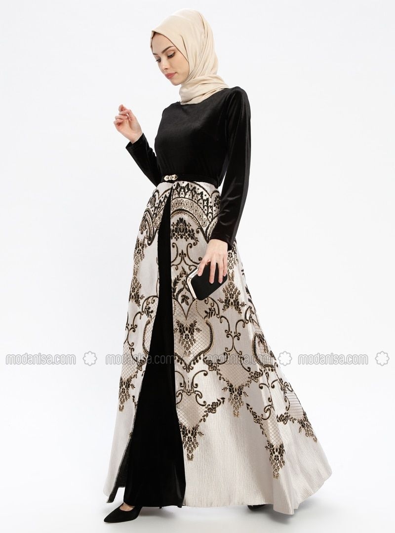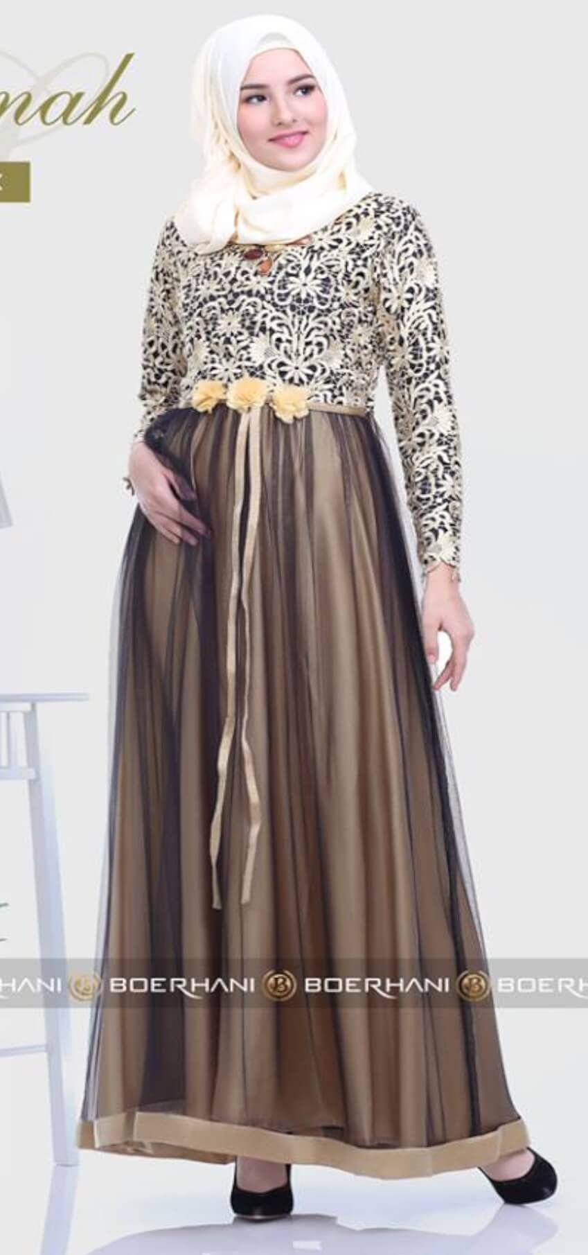 Tampil mewah memang idaman bagi sebagian kaum wanita. Terlebih jika akan hadir di suatu acara, harus menampilkan perpaduan yang serasi dan sempurna. Setelan gamis dengan tambahan motif brokat bunga, dengan kombinasi warna hitam dan gold. Agar terkesan lebih mewah untuk bawahan rok gunakan bahan satin dengan warna gold dan beri tambahan veil warna hitam.