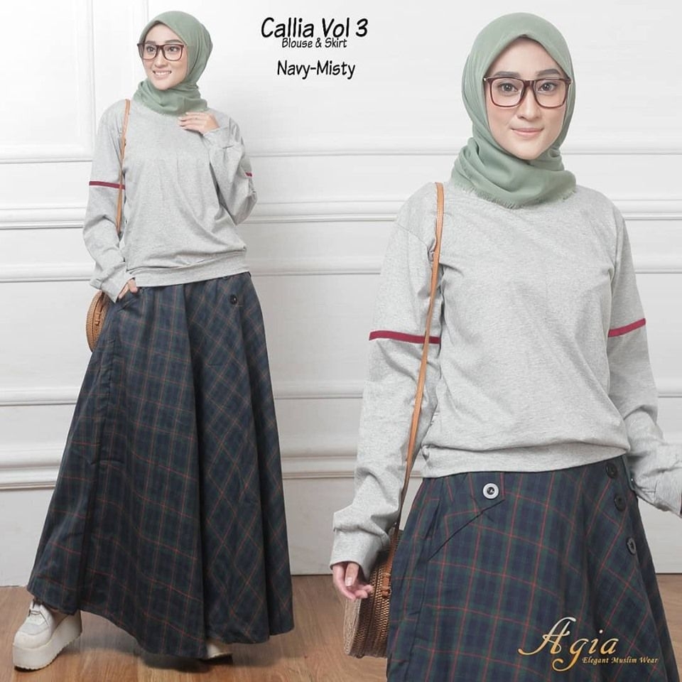 Gak harus dengan model langsungan yang bisa membuatmu tampil mewah. Setelan sweater berwarna abu dikombinasikan dengan rok motif kotak- kotak warna hijau tua ini juga bisa membuatmu tampil keren dan elegan. Pada bagian sweater ada tambahan kain sedikit di bagian lengan agar model sweater yang digunakan tidak terlalu polos. Untuk jilbab bisa anda kenakan jilbab rawis model segi empat. Warna senada dengan rok agar kamu tampil lebih pede.