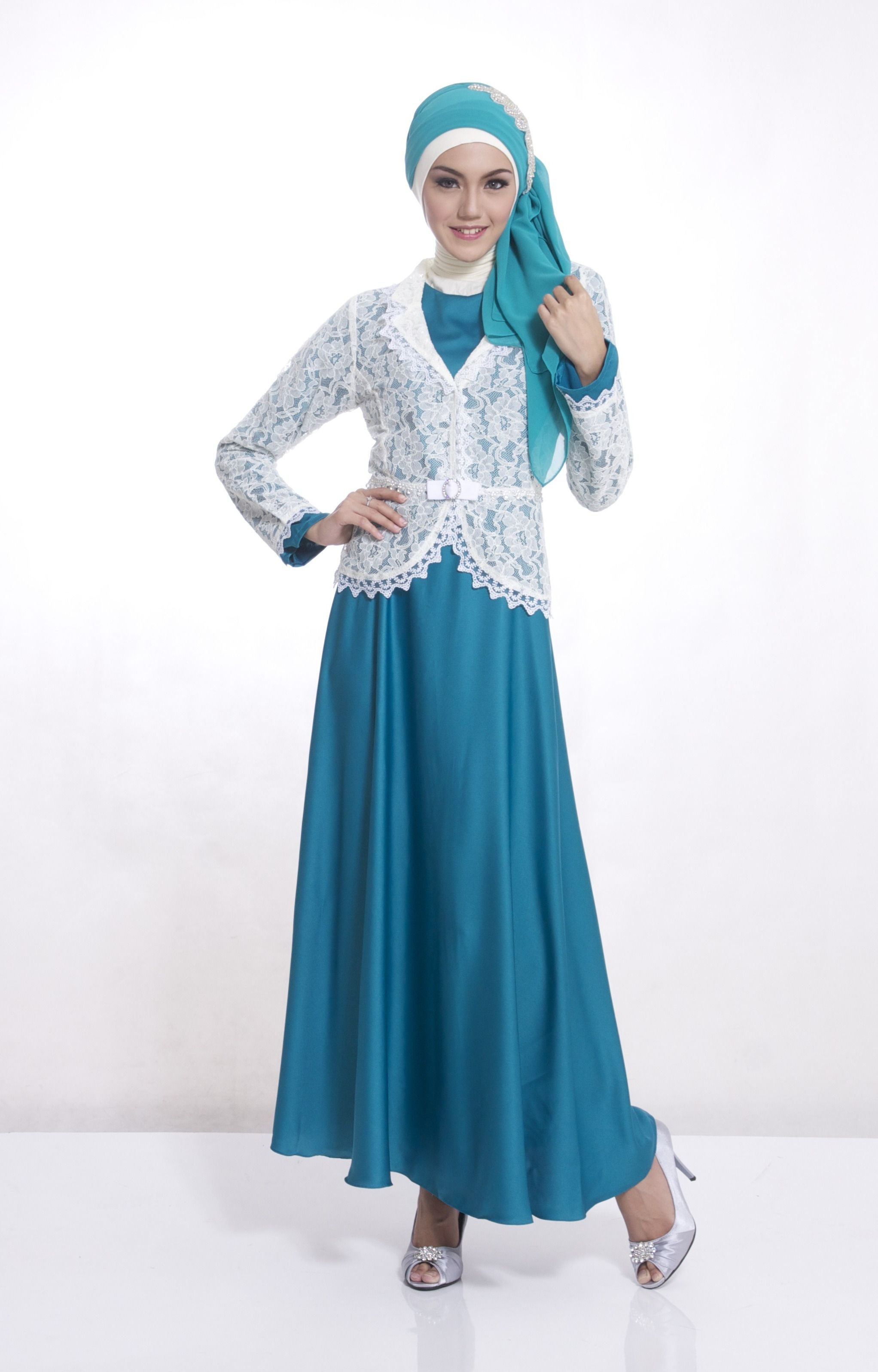 Gamis model ini tentu sudah tidak asing lagi bagi kita. Model maxi terusan dengan bahan sifon berwarna tosca bisa anda tambah dengan kombinasi atasan brukat warna putih. Pada bagian brokat tambahan aksesoris pita juga semakin menambah gamis ini terlihat mewah digunakan. Untuk jilbab sebaiknya gunakan dengan model simple seperti gambar diatas dengan beberapa kreasi.