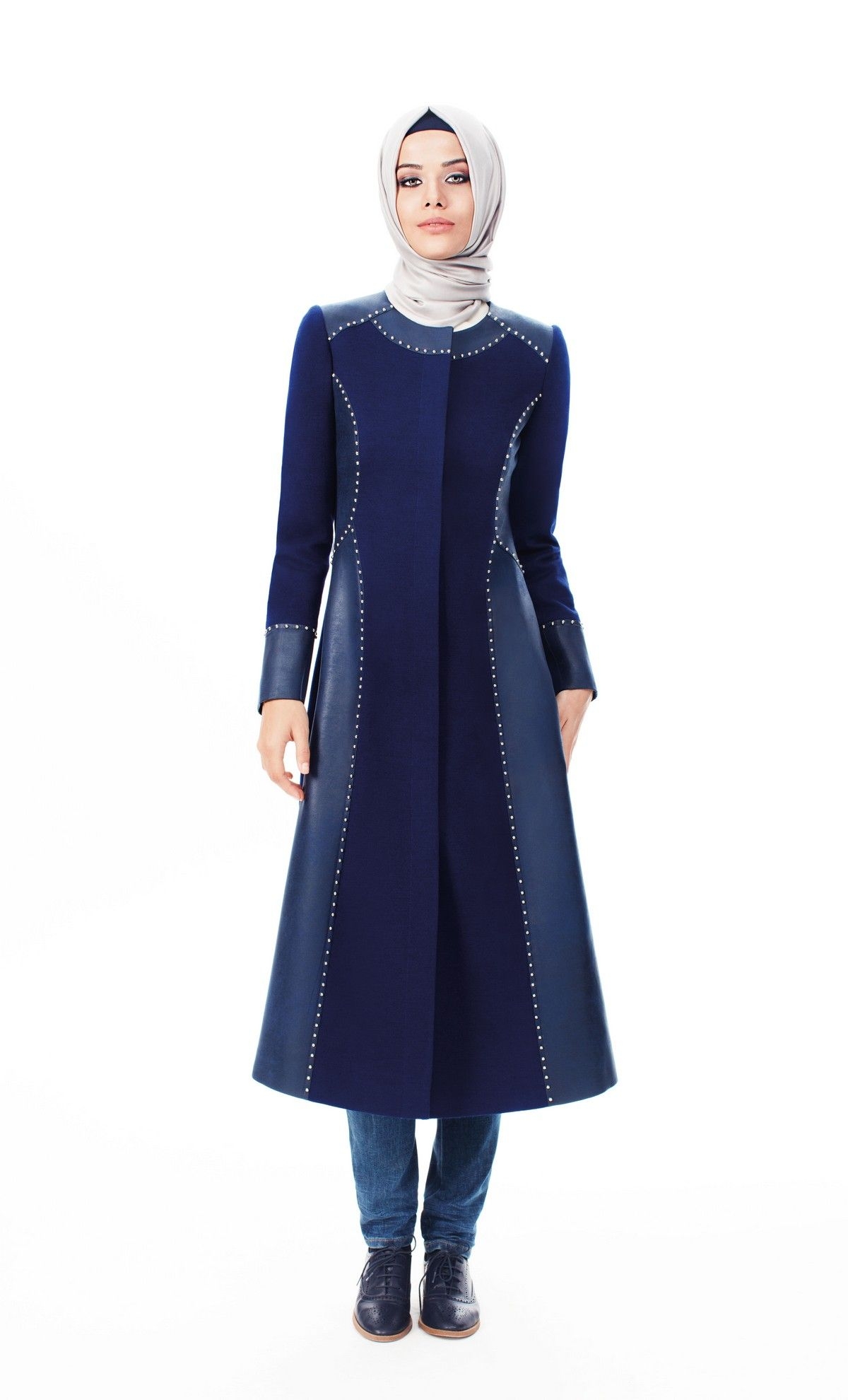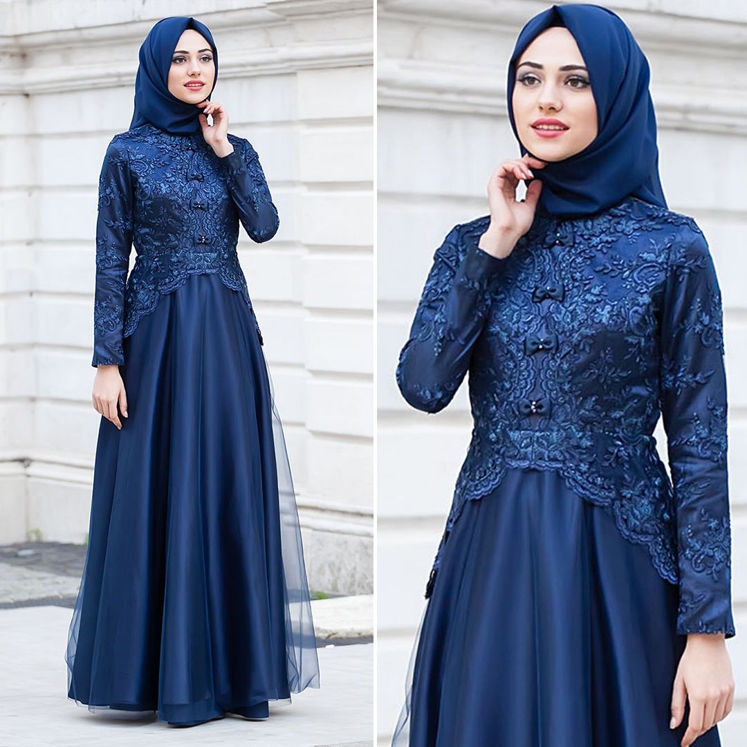 Selain warna Abu warna navy juga salah satu warna yang netral digunakan. Gamis dengan model terusan dikombinasikan dengan brokat pada bagian atas. Sangat terlihat berkelas dan mewah dengan adanya tambahan aksesoris pita yang menempel pada bagian atas sebagai pengganti kancing. Untuk Bawahan rok dibiarkan saja dengan motif polos diberi tambahan kain veil secara melingkar.