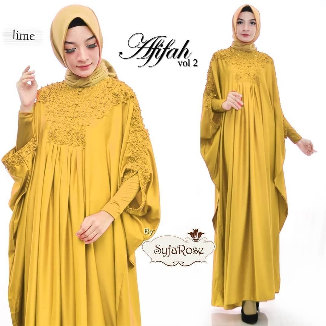 Jika anda ingin terlihat cerah dan meriah di suatu acara . Penggunaan warna kuning pada gamis adalah tema yang pas. Warna kuning bisa membuat wajah anda terlihat cerah. Gamis model kelelawar bisa digunakan untuk anda yang mempunyai tubuh langsing, akan terlihat tinggi semampai. Model Gamis ini hanya mempunyai panjang lengan tujuh per delapan sebaiknya gunakan manset dengan warna yang senada.