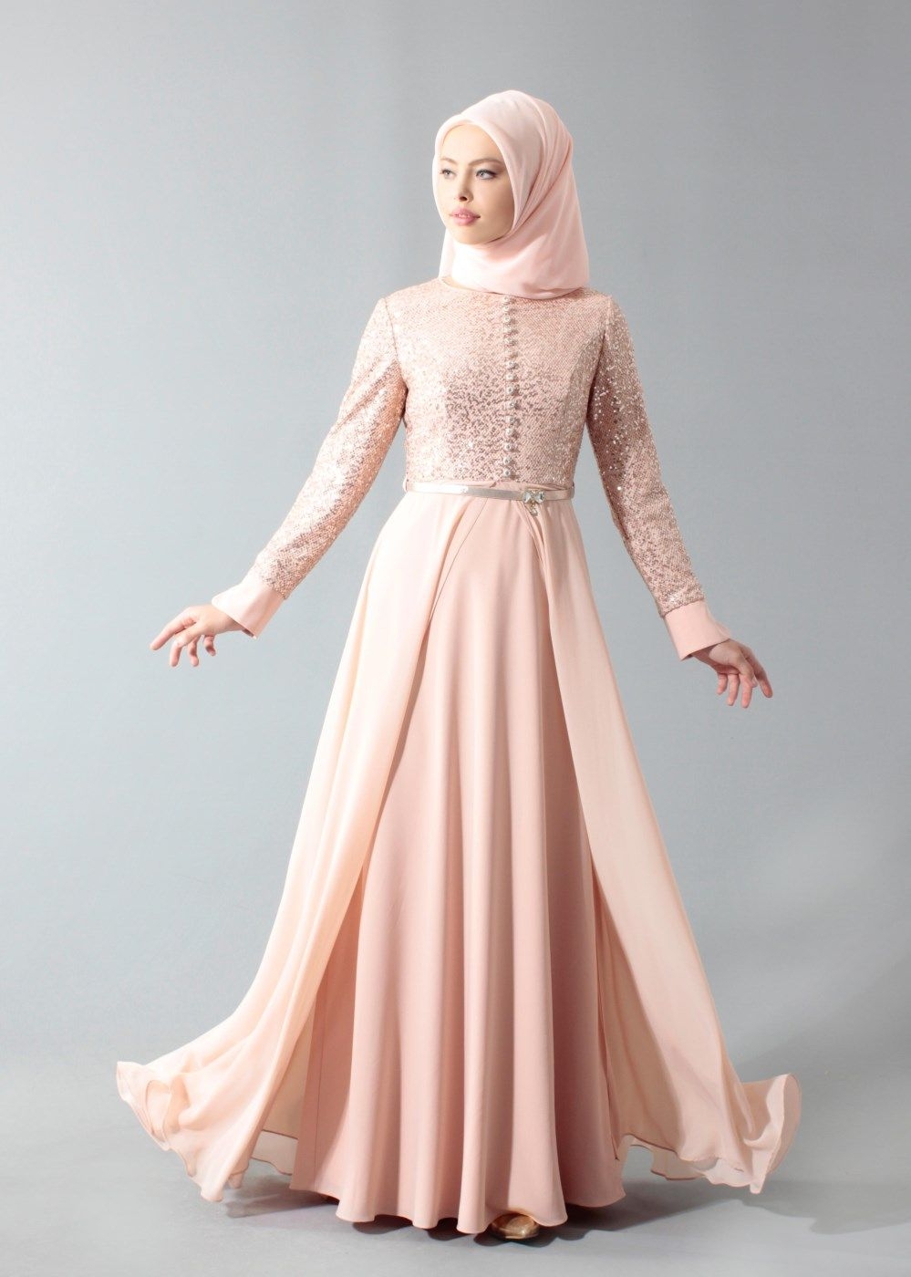 Selanjutnya adalah model gamis terusan dengan beberapa tambahan motif pernak pernik di bagian atas. Pada bagian pinggang ada tambahan ikat pinggang dengan warna silver. Model gamis bagian bawah dibentuk menjadi dua model dan ada tambahan kain sifon pada pinggirnya. Bagi anda yang memakai model gamis ini akan terlihat sangat mewah dan berkelas.