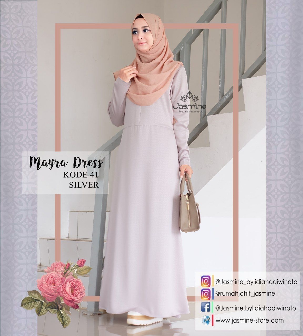 Mix dan Mat sangat diperlukan untuk penampilan. Perlu adanya kombinasi yang cocok antara pakaian dengan aksesoris lain yang digunakan. Kesan mewah tidak harus glamor kok, dengan perpaduan yang pas bisa anda pakai agar terlihat maksimal. Gamis terusan warna peach berbahan satin memang pas dikombinasikan dengan tambahan brokat warna hijau.