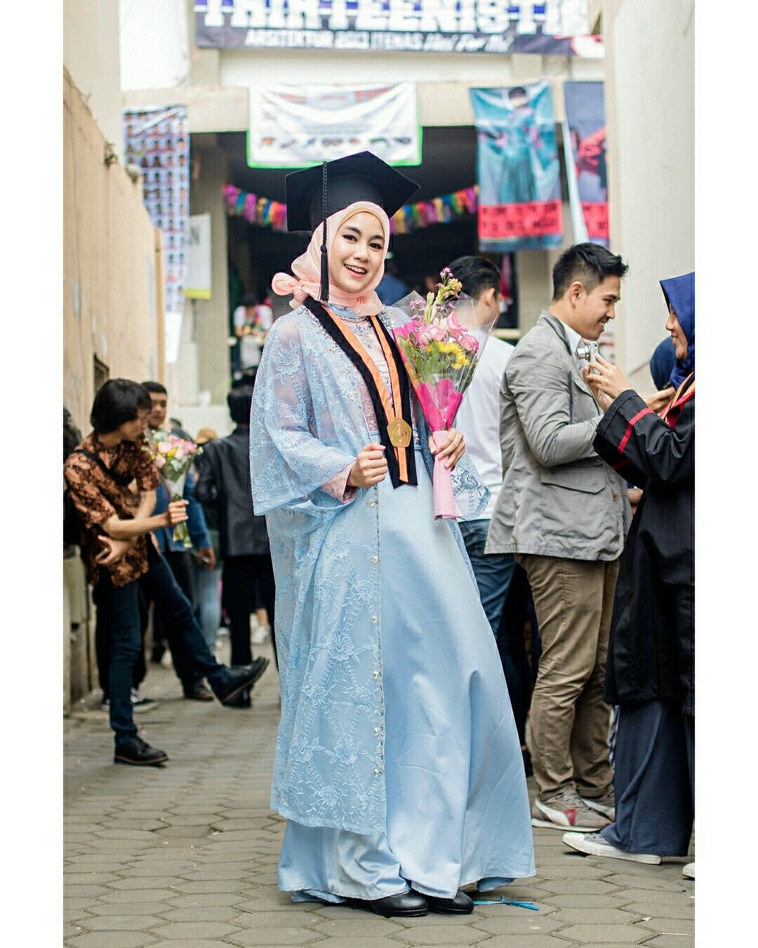 Bagi sebagian kaum perempuan terutama untuk mereka yang berpenampilan syar’i . Pakaian kebaya memang terlihat sangat membentuk badan. Anda bisa melengkapinya dengan menggunakan baju gamis dengan bahan yang tidak terlalu tebal seperti bahan sifon ini. Kombinasikan dengan aksen brokat dengan warna senada. Dengan begitu tampilan wisuda anda tetap tertutup namun terkesan mewah dan elegan.