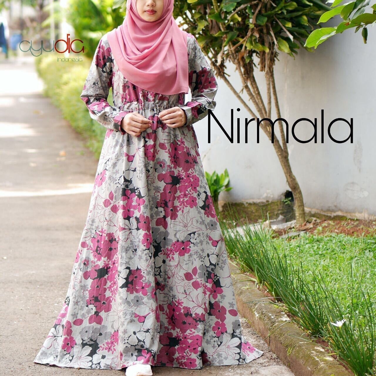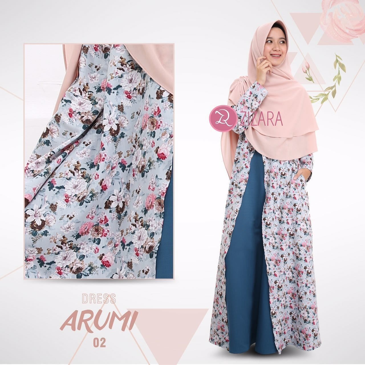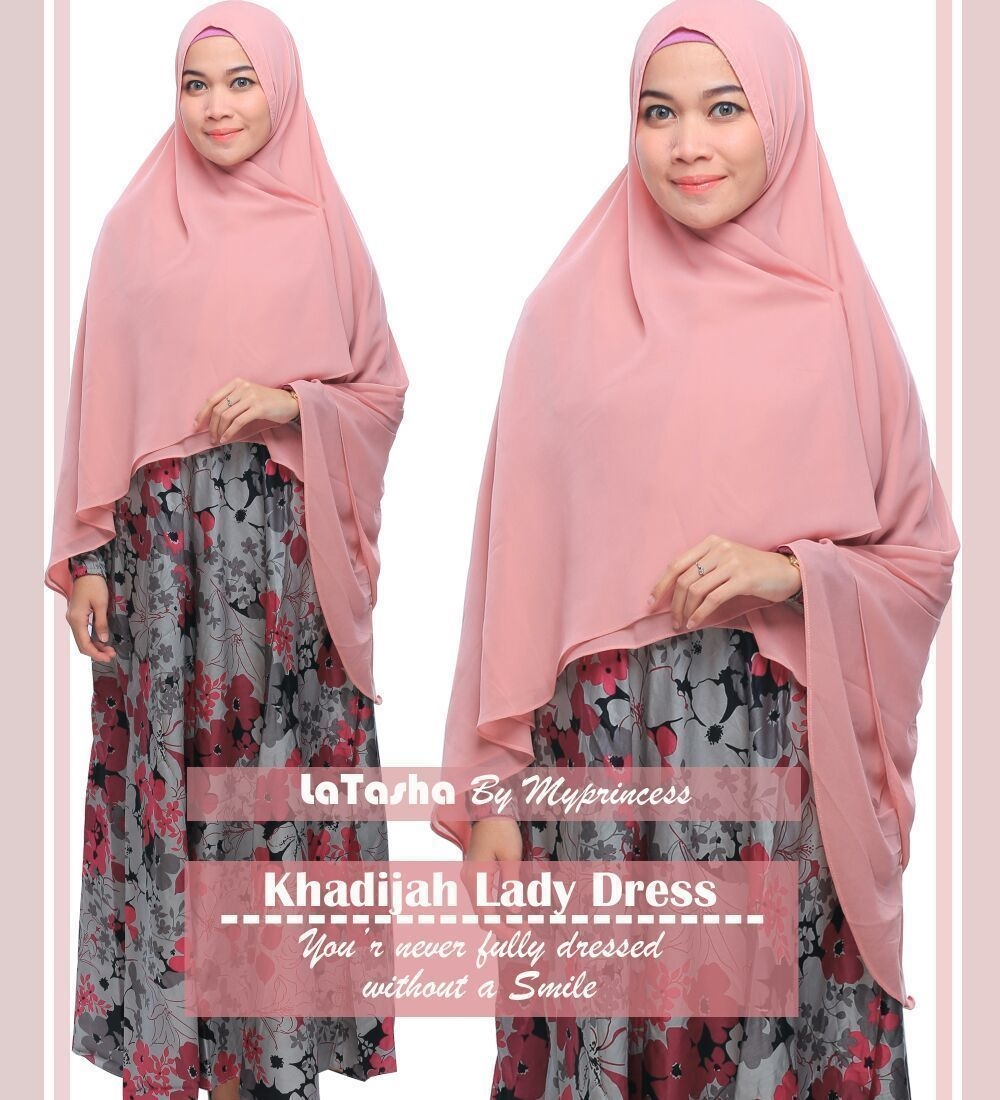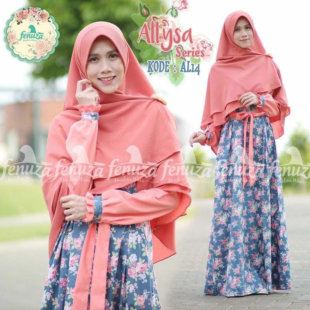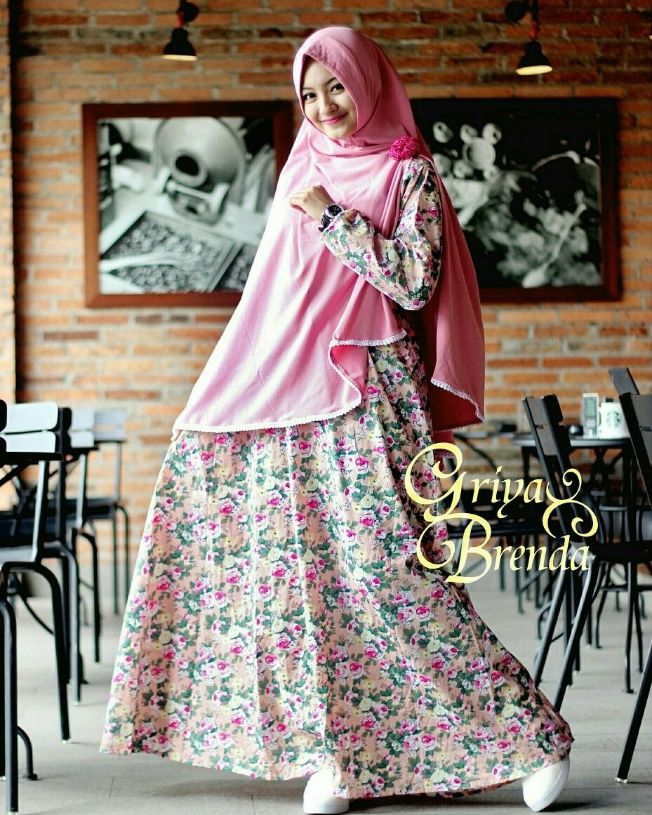 Corak motif bunga dari gamis ini jika dilihat memiliki dua warna yang dominan yaitu coklat dan abu. Tentu sangat berguna bagi anda yang ingin mengkombinasikan dengan jilbab. Bisa anda gunakan dengan jilbab motif polos warna abu seperti gambar ini. Penampilan anda sangat cantik dan modis.