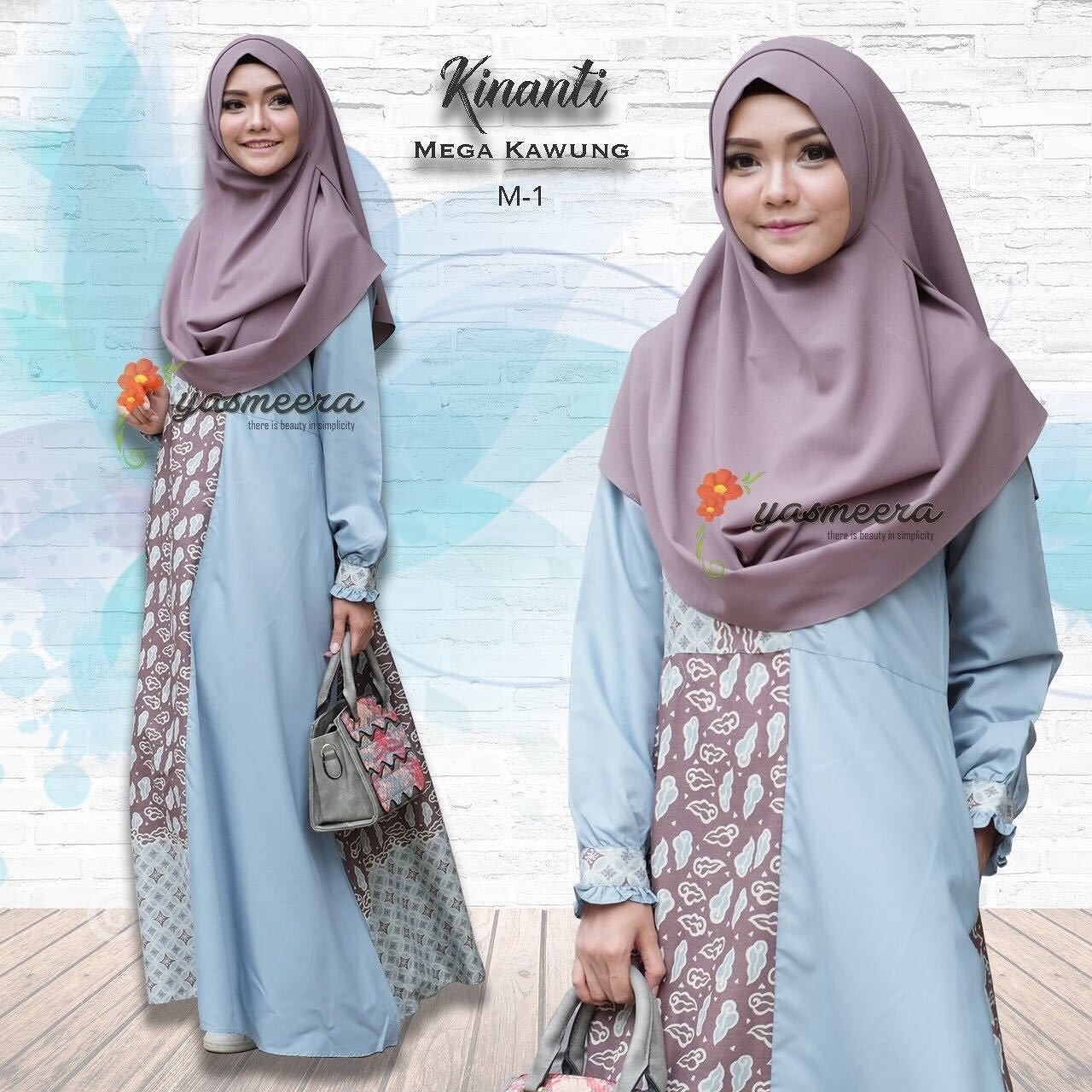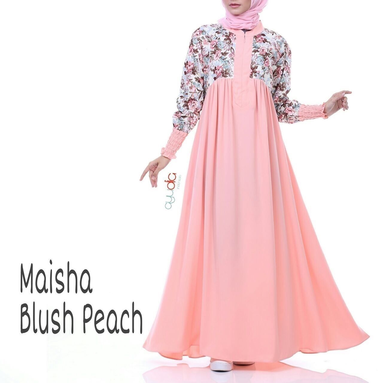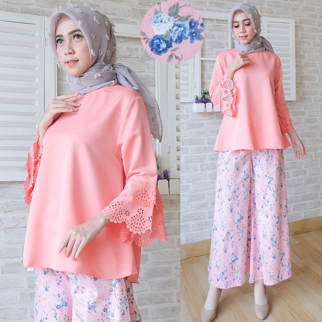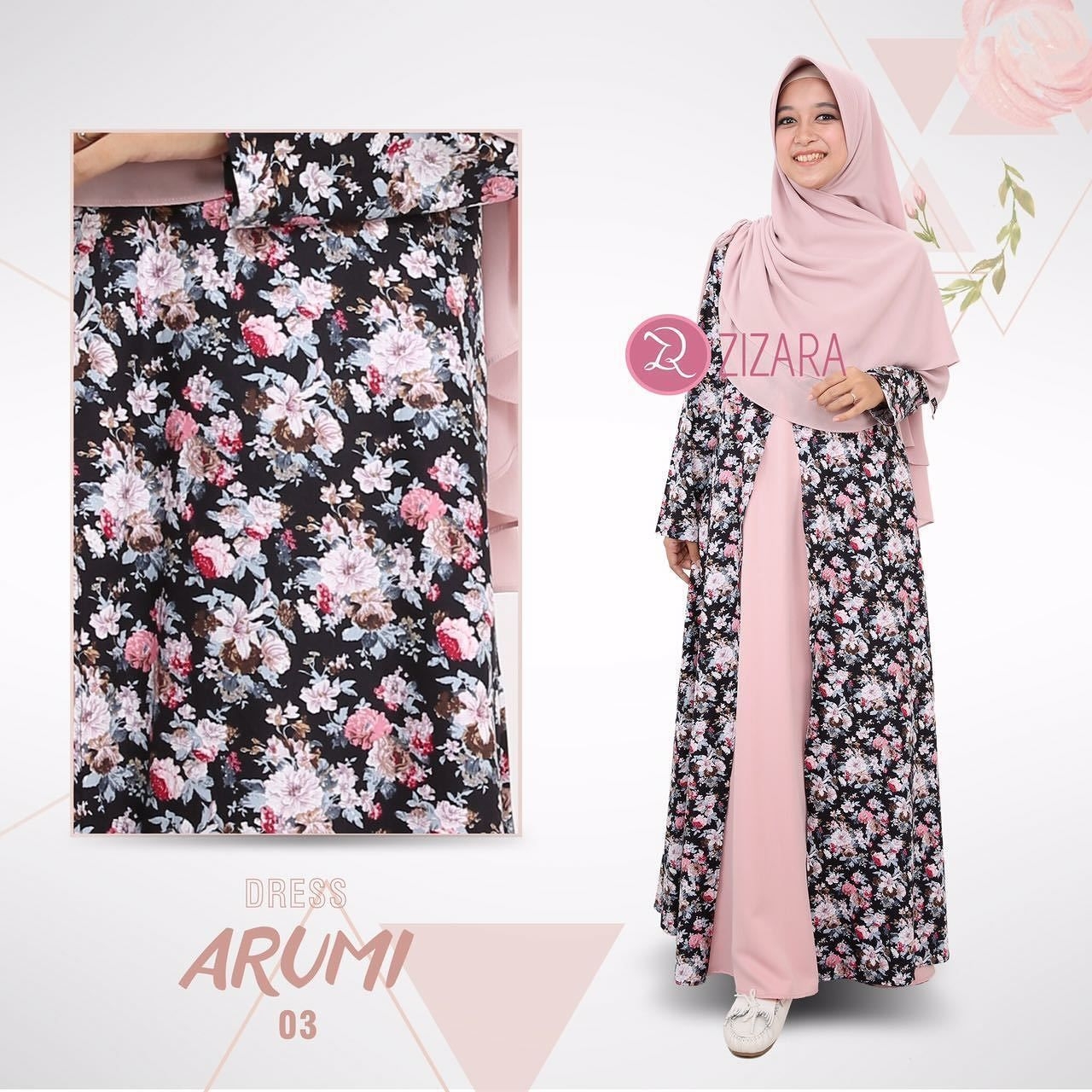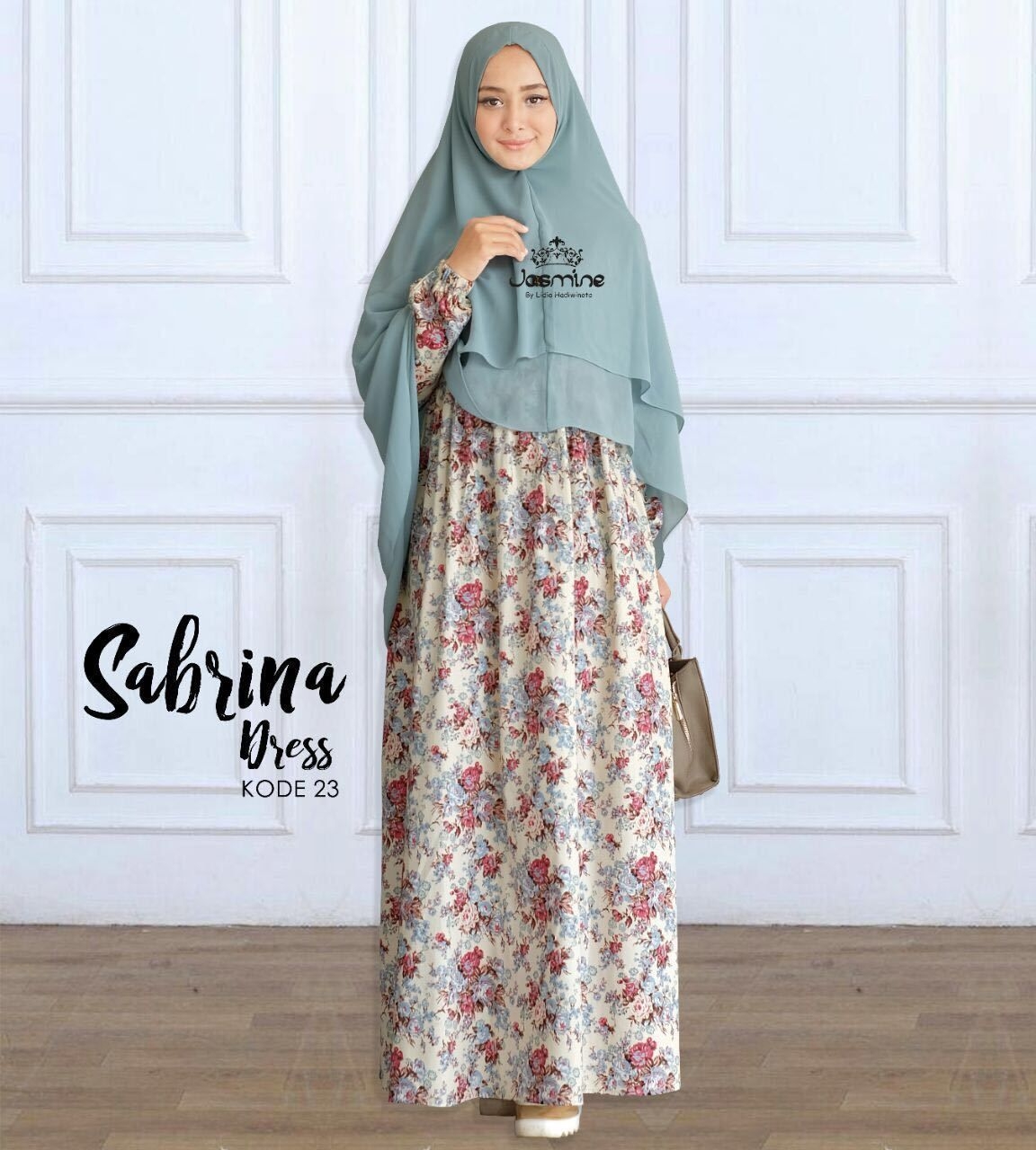 Corak motif bunga dari gamis ini jika dilihat memiliki dua warna yang dominan yaitu coklat dan abu. Tentu sangat berguna bagi anda yang ingin mengkombinasikan dengan jilbab. Bisa anda gunakan dengan jilbab motif polos warna abu seperti gambar ini. Penampilan anda sangat cantik dan modis.
