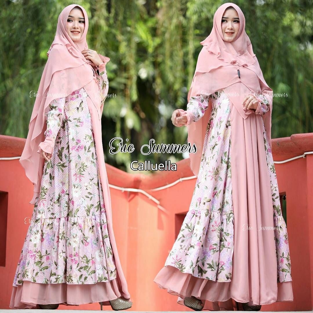 Gamis katun jepang ini memiliki bahan dasar warna pink yang dikombinasikan dengan motif bunga dan daun berwarna hijau. Terlihat sangat meriah terlebih jika digunakan untuk acara pesta pernikahan. Modelnya yang syar’i tentu menambah kesan tersendiri bagi pemakainya. Untuk jilbab gunakan jilbab model bergo warna pink. Tambahkan sepatu sneakers warna putih agar gayamu makin kekinian.