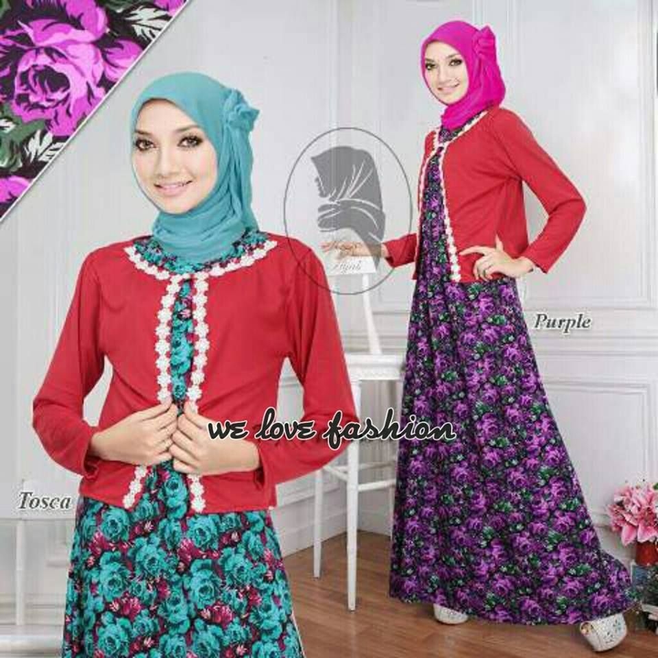 Model gamis ini pada bagian dalam dibuat maxi tanpa lengan dengan model full motif. Agar tampilan anda lebih kece dan modern, kombinasi kan dengan cardigan warna merah. Pada cardian untuk tambahan aksen cukup sematkan satu kancing saja di bagian paling atas. Agar motif gamis katun jepang tetap terlihat.