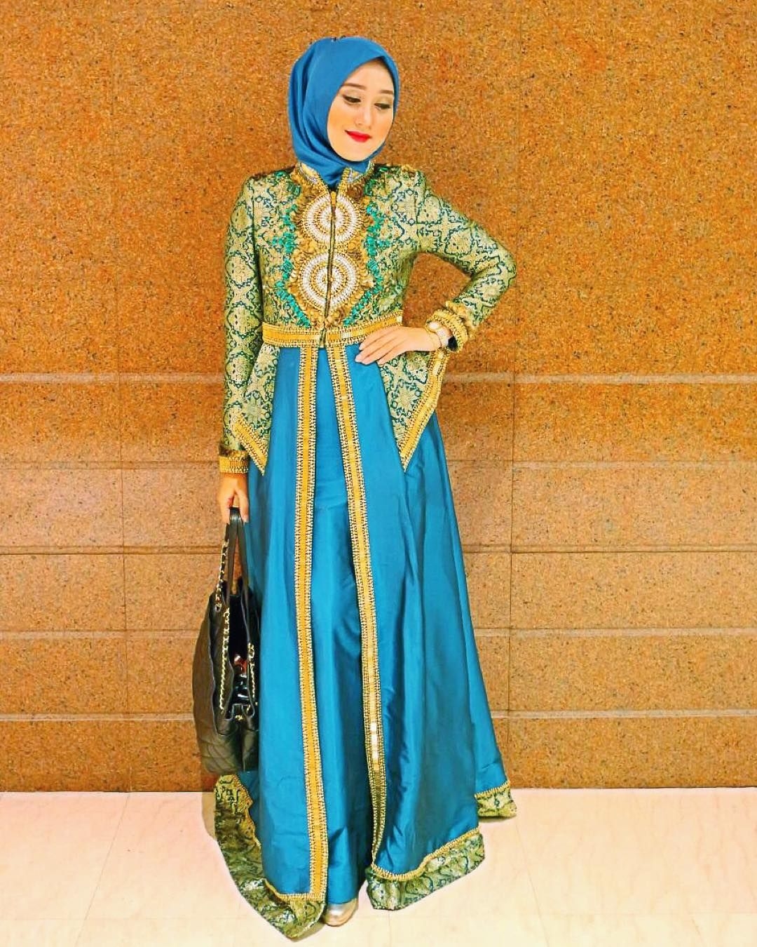 Gamis ini terlihat berkelas dengan modifikasi songket dan bahan satin yang digunakan. Pada bagian atas gamis ini sangat full motif songket dengan model hampir mirip seperti kebaya. Pada bagian bawah rok berbahan satin warna tosca dengan sedikit tambahan kain songket. Bahan satin yang memiliki tekstur mengkilat membuat gamis ini semakin modis dan terlihat mewah saat di kenakan di berbagai acara.