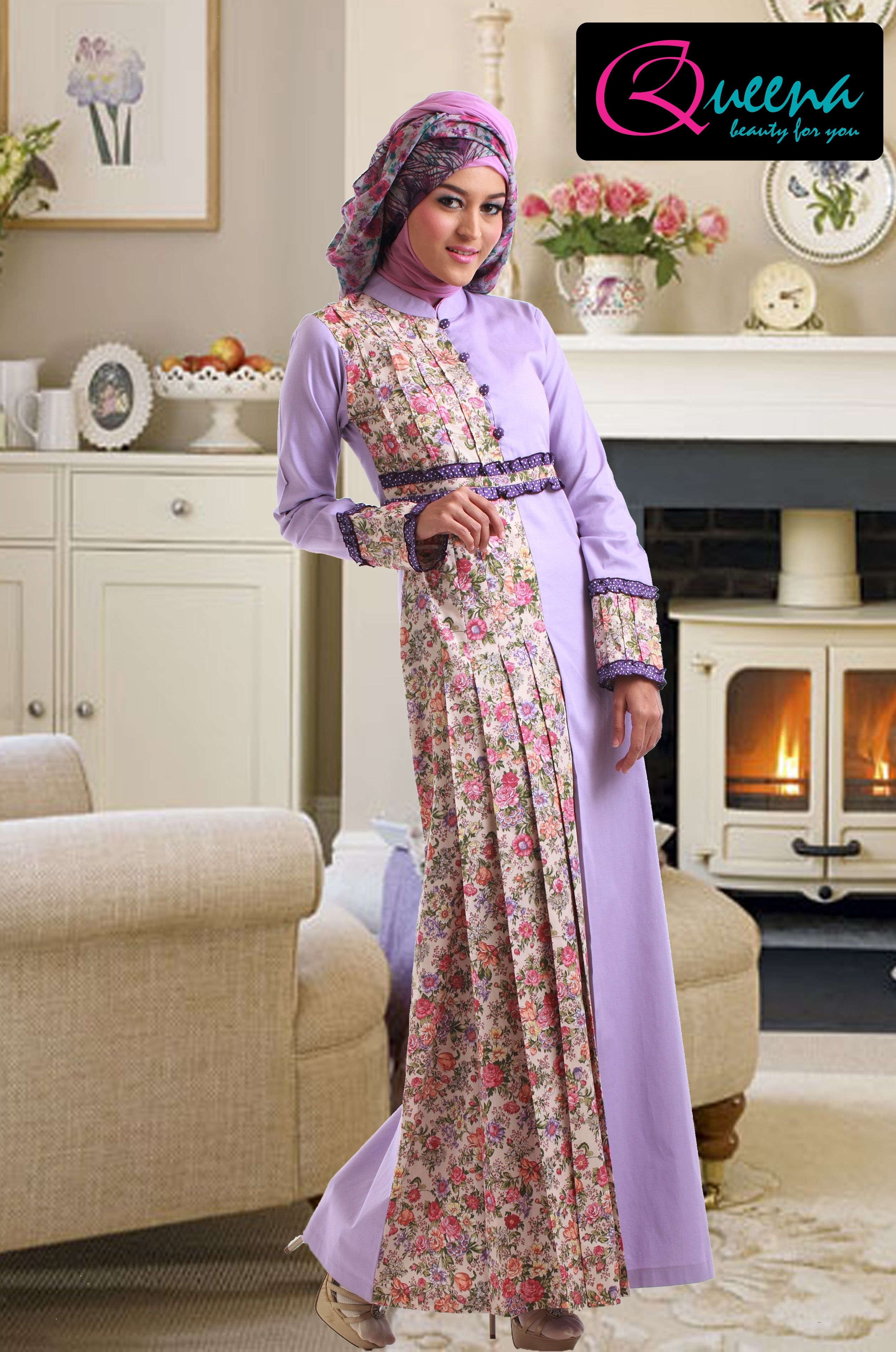 Jika anda penggemar model dengan gamis yang full motif mungkin jenis gamis kombinasi di atas bisa anda coba. Modelnya yang dibagi menjadi dua bagian yaitu motif bunga yang dibentuk seperti lipatan dan kombinasi kain satin warna ungu di sebelahnya. Untuk anda terutama yang masih menyusui, gamis ini pas digunakan karena pada bagian atas ada tambahan kancing yang bisa anda manfaatkan.
