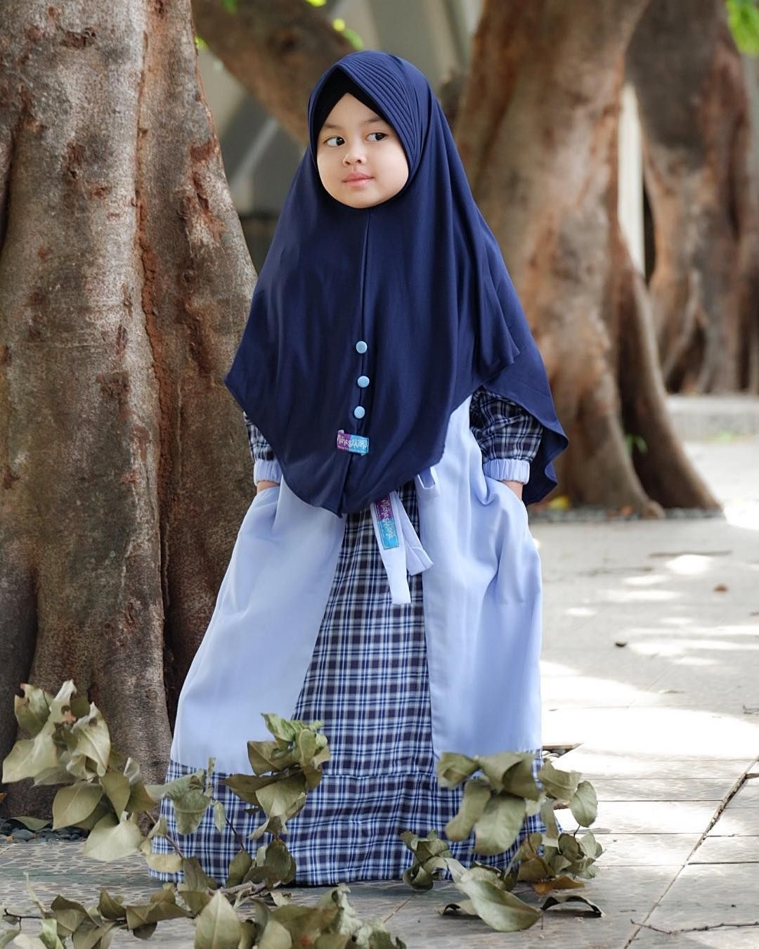 Anak-anak sekarang ini tentu juga tidak bisa lepas dengan gamis. Karena baju model ini sangat simple digunakan untuk kegiatan harian. Seperti model anak ini bisa digunakan untuk hari lebaran maupun acara TPA. Model gamis dengan motif kotak-kotak warna biru muda dikombinasikan dengan satin biru polos. Membuat penampilan anak ini semakin manis saja.