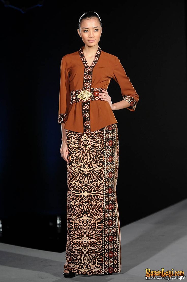 Selain model gamis dalam pergi ke acara pesta bagi sebagian orang juga sering menggunakan model kebaya. Modelnya yang minimalis dan memberikan kesan feminin sehingga menjadi salah satu bahan lirikan. Model kebaya batik ini pada bagian atas bisa anda kombinasikan dengan kain satin berwarna coklat muda. Tambahkan aksesoris pada bagian perut, agar penampilan anda terlihat mewah.