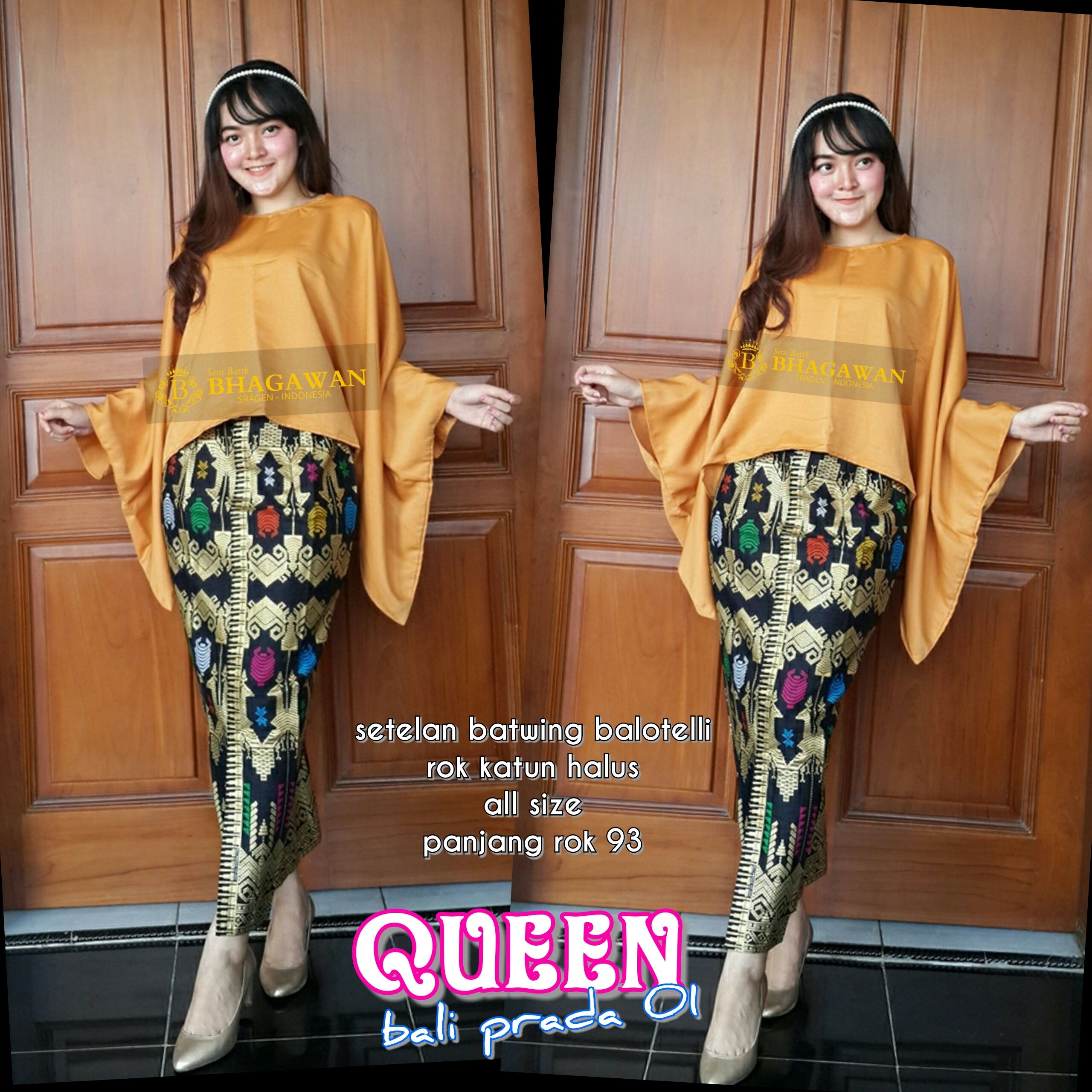 Jika model kebaya anda pada bagian rok sudah full motif batik seperti ini. Anda bisa menggunakan atasan dengan kain polos bahan satin berwarna kuning. Warna kuning memberikan kesan yang lebih cerah dan meriah. Atasan dibentuk seperti blus dan dmodel kelelawar. Penampilan anak muda banget terlihat simple dan kece.